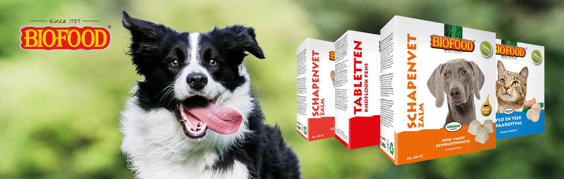 Naast hoogwaardige natuurlijke kwaliteitsvoeding heeft BIOFOOD haar eigen natuurlijke, smaakvolle en aanvullende verzorgingsartikelen, waaronder vetten, supplementen, snacks en tabletten maar ook natuurkruiden en kauwkluiven. Het GROEN-garantie label waarborgt een natuurlijk, veilig en gezond eindproduct, zonder chemische toevoegingen. Kies voor biofood tabletten i.p.v. chemische pipetten, voor de natuurlijke bestrijding tegen parasieten en ongedierte. Bekijk de producten op deze pagina of kom langs in de Discus dierenspeciaalzaak.