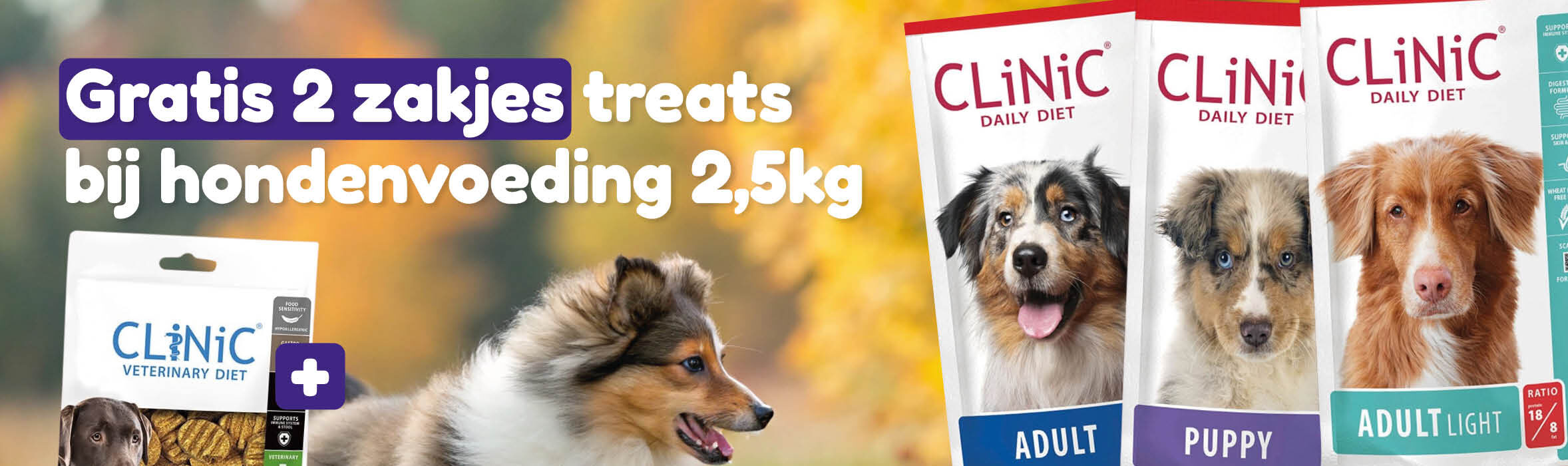 TIP: Om je hond of kat te verwennen of belonen zijn er CLiNiC Treats. Deze zijn speciaal geformuleerd om de werking van dieetvoeding te ondersteunen en het dieetpatroon niet te verstoren.