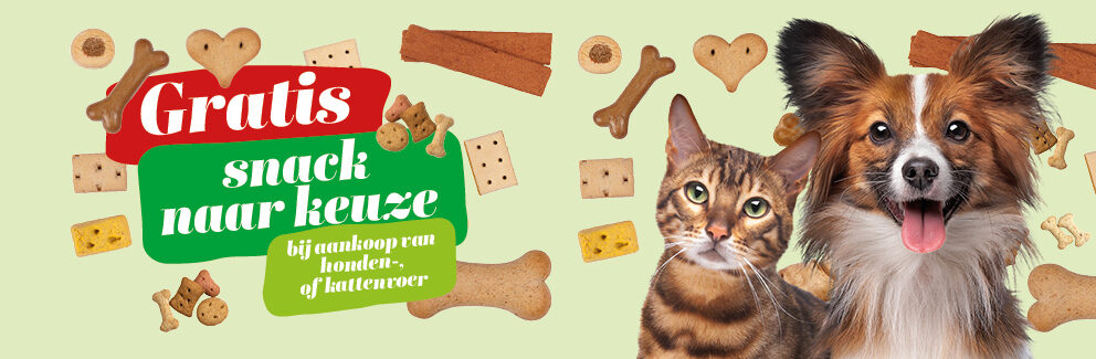 Bij aanschaf van een zak hondenvoer of kattenvoer van minimaal 2 kilo ontvang je een snack naar keuze t.w.v. €2,99. Bij aankoop van een zak hondenvoer, of kattenvoer van minimaal 10 kilo, ontvang je een snack naar keuze t.w.v. €5,99.