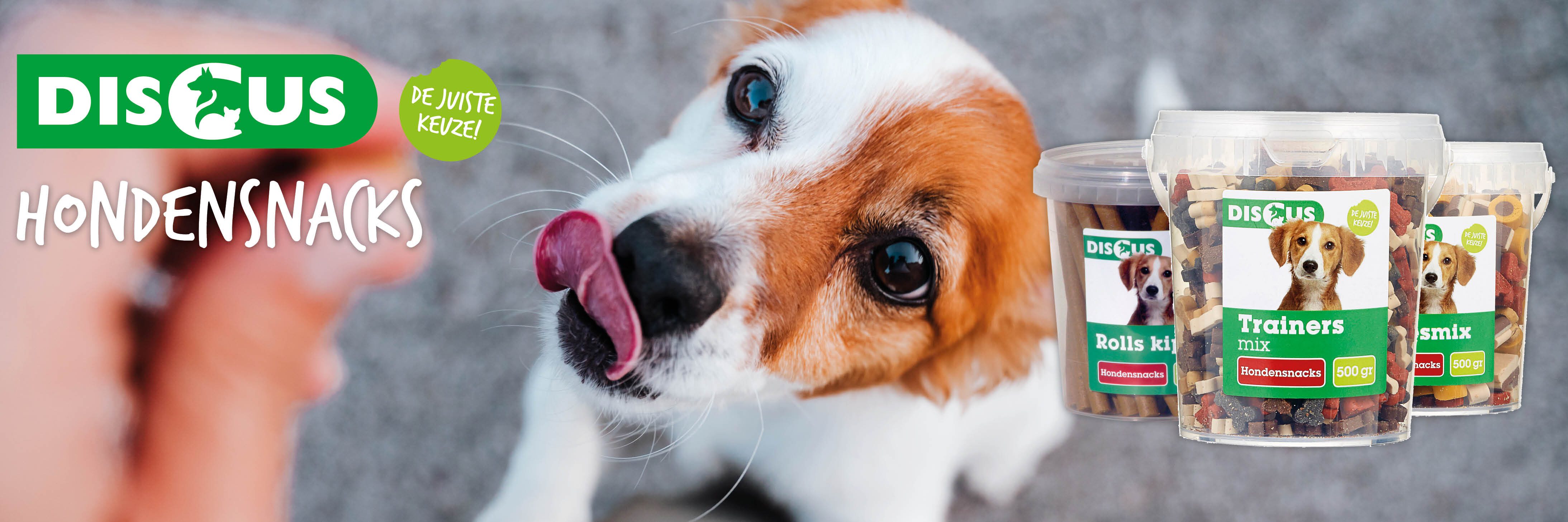 De meeste honden houden wel van een koekje als beloning of een lekker tussendoortje tussen de wandelingen door. De liefde gaat nou eenmaal door de maag, ook bij honden! Discus hondenkoekjes, snacks en trainers zijn erg geschikt voor deze dagelijkse verwennerij. Ze zijn namelijk niet alleen érg lekker, ze zijn ook nog eens heel gezond. Het Discus Huismerk biedt een ruime keuze in verschillende vormen, hardheid en smaken, zodat er voor iedere hond een favoriete lekkernij te kiezen is!