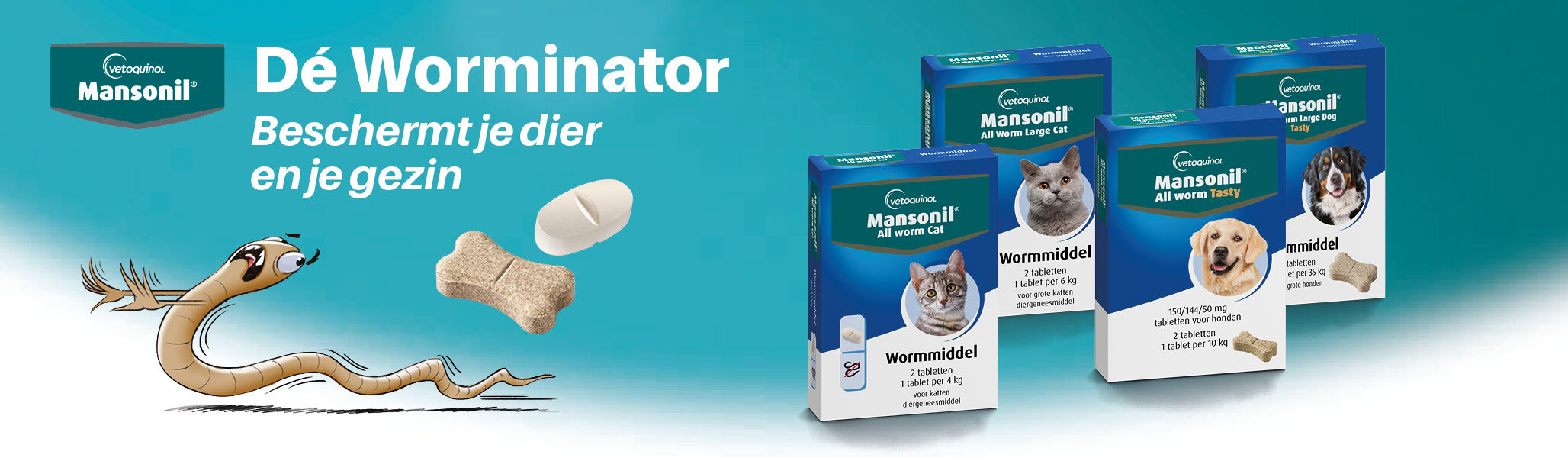 Mansonil ontworming bestrijdt alle belangrijke maag-darmwormen: rond- én lintwormen! De tabletten zijn nu smakelijker dan ooit en hebben een handige breuklijn voor lekkere ontworming op maat! Verkrijgbaar bij Discus voor hond en kat. Ook veilig voor collie-achtige rassen met MDR-1-genafwijking én bovendien tijdens dracht en zogen!