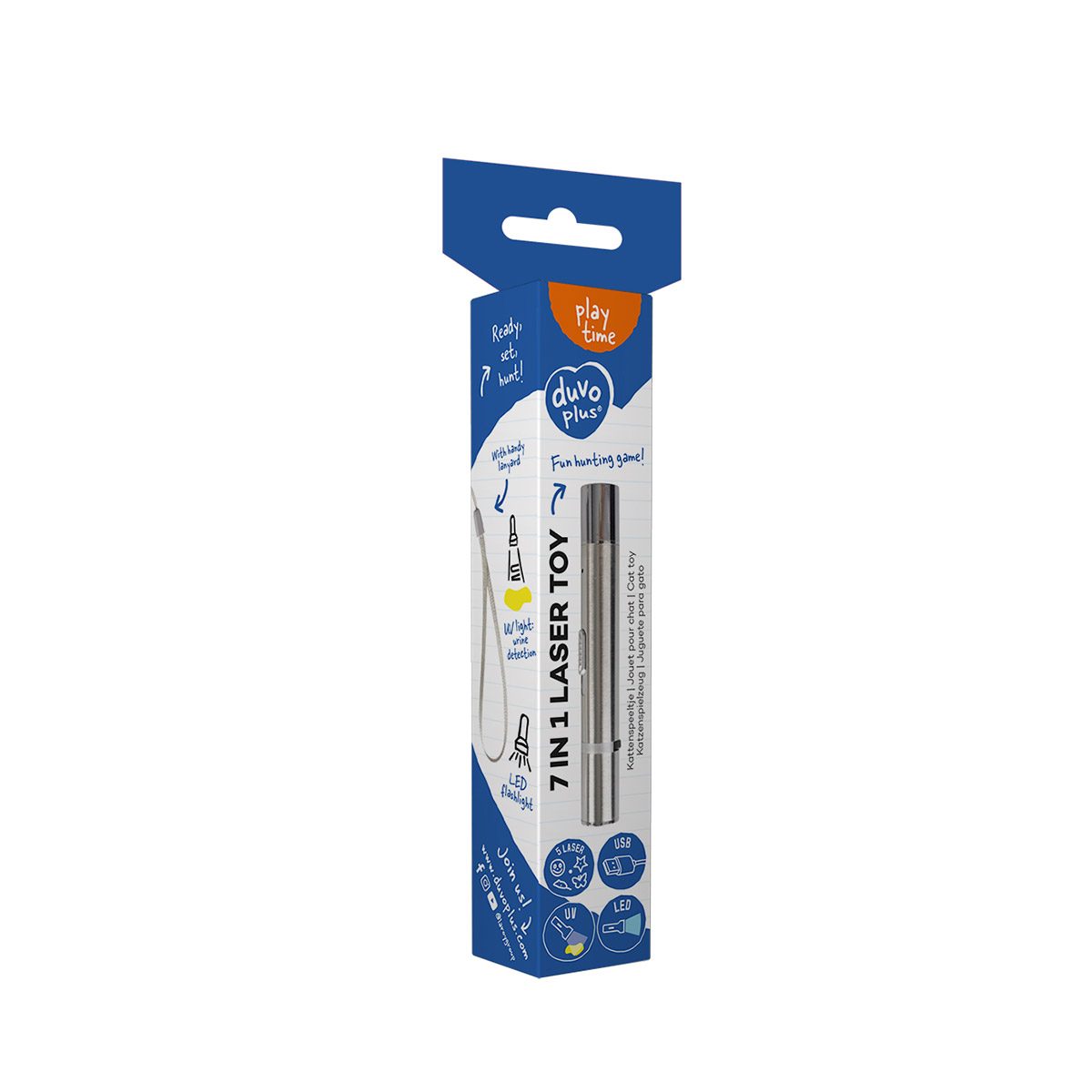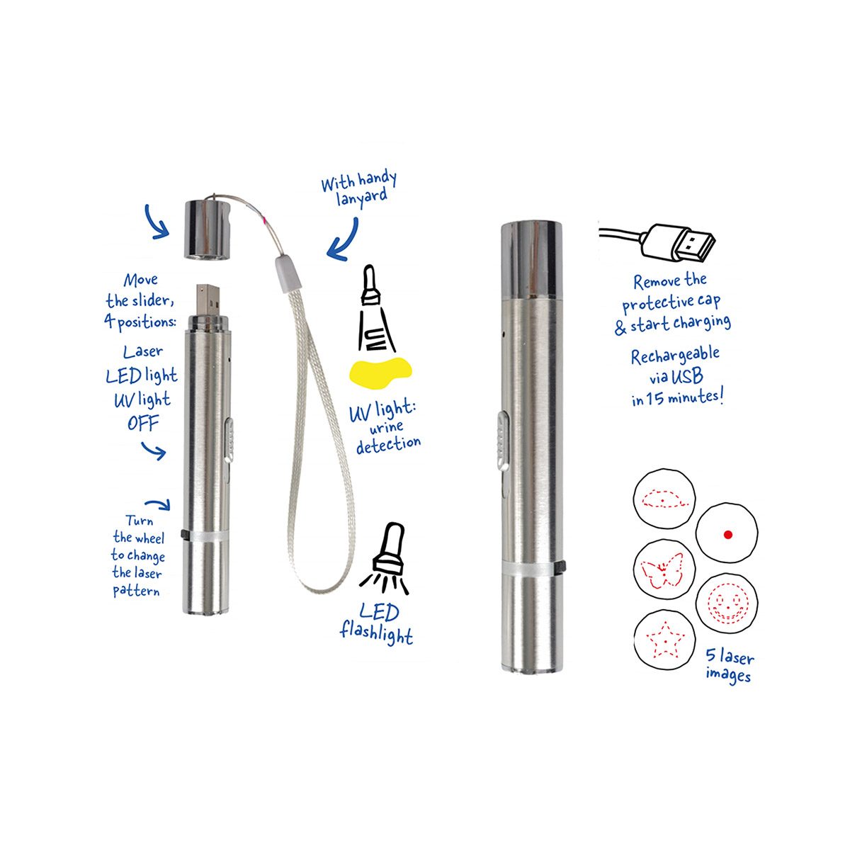 Deze laserpen heeft 5 verschillende figuren die je kunt projecteren. Zo heb je het rode laserpuntje, een sterretje, een muisje, een vlinder en een smiley. Ook heeft de laserpen een UV lampje en een LED lampje. De UV lamp is handig om bijvoorbeeld te zien waar je viervoeter geplast heeft. Of om te controleren of je viervoeter een huidziekte heeft. Als je licht blauwen/groene plekjes ziet op de huid, betekent het dat je kat een huidziekte heeft. Zo kan je nog veel meer met de UV functie! De pen is USB oplaadbaar zonder snoer.