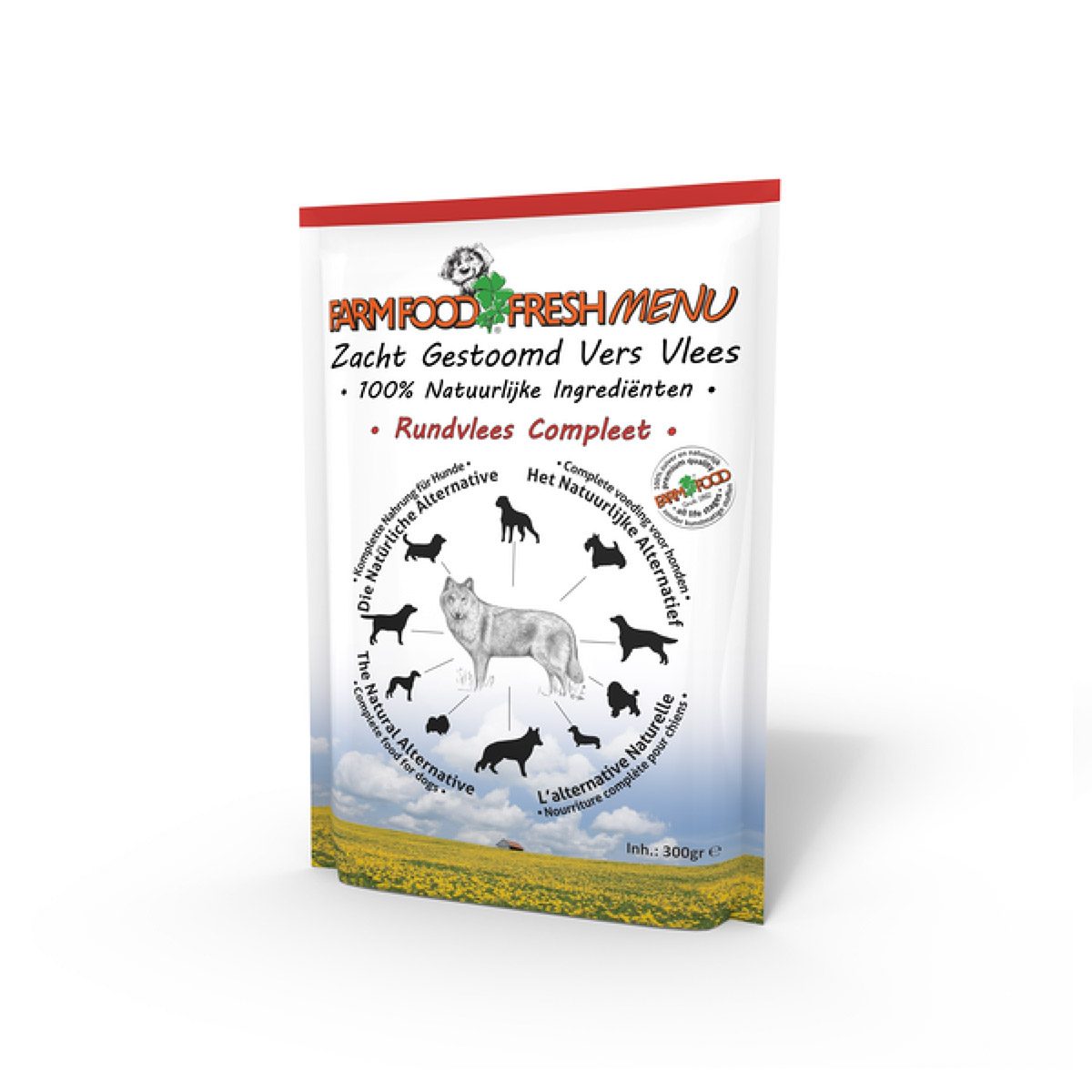 Farm Food Fresh Menu Rundvlees Compleet 300 gr. Farm Food Fresh Menu: de natuurlijke, gezonde en lekkere complete vers-vleesmaaltijd voor jouw hond. Complete, zacht gestoomde vers-vleesvoeding voor alle honden van pup tot senior. Alle dierlijke ingrediënten in Farm Food Fresh Menu zijn afkomstig van dieren uit de EU die goedgekeurd zijn voor menselijke consumptie. Farm Food Fresh Menu is op basis van rund en bevat geen kip of ander gevogelte. Farm Food Fresh Menu is op basis van puur runderhart, runderpens en rundvlees, aangevuld met Schotse zalmolie, mineralen, organische vitamines en sporenelementen. Farm Food Fresh Menu bevat geen bot en daarom is een gecontroleerde calcium/fosfor verhouding gegarandeerd.