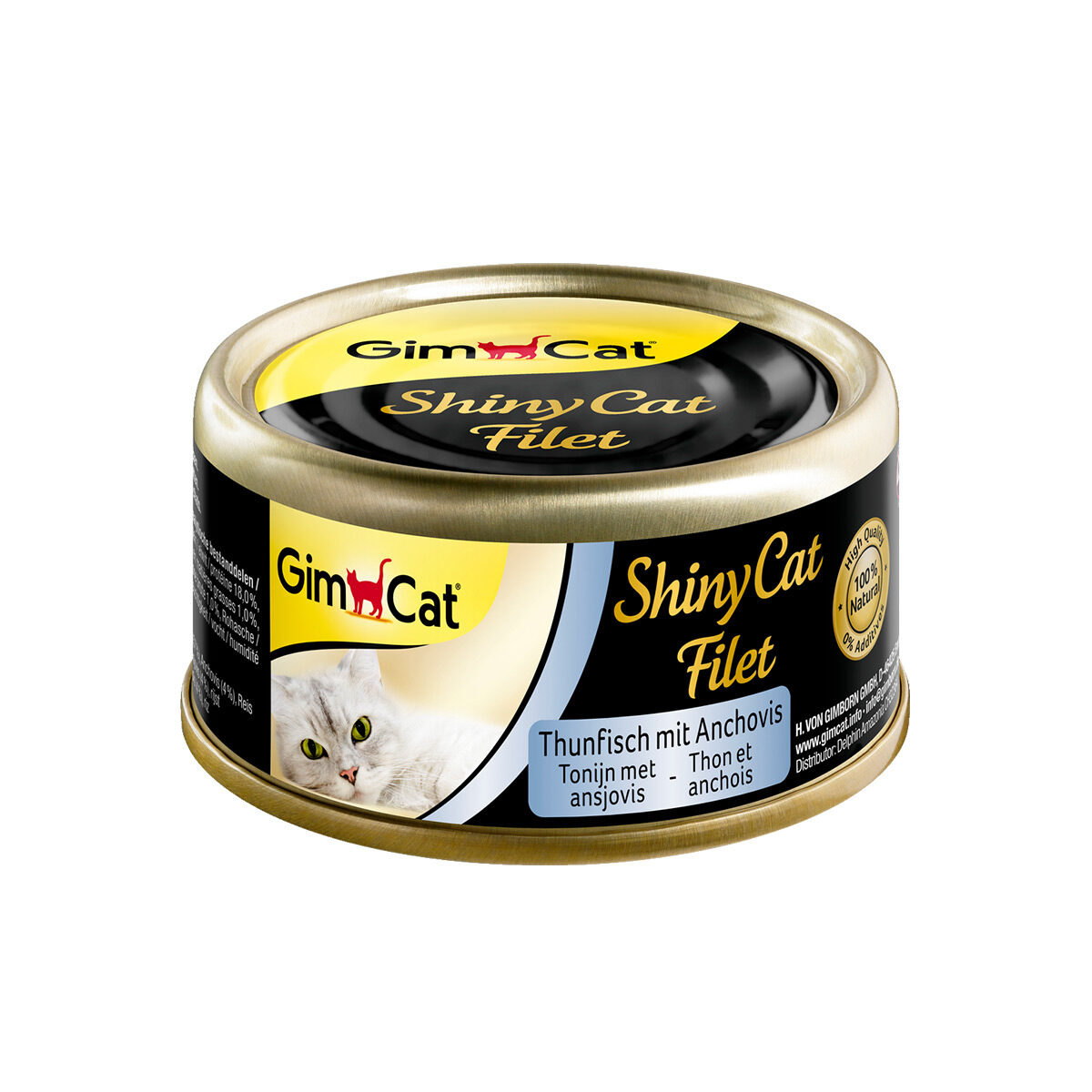 GimCat ShinyCat Filet Tonijn&Ansjovis 70gr. GimCat ShinyCat Filet bevat heerlijke proteïnerijke stukjes filet die zorgvuldig in bouillon zijn gegaard, waardoor alle belangrijke voedingsstoffen behouden zijn gebleven. Het natvoer is gemaakt van natuurlijke ingrediënten en vrij van toevoegingen.