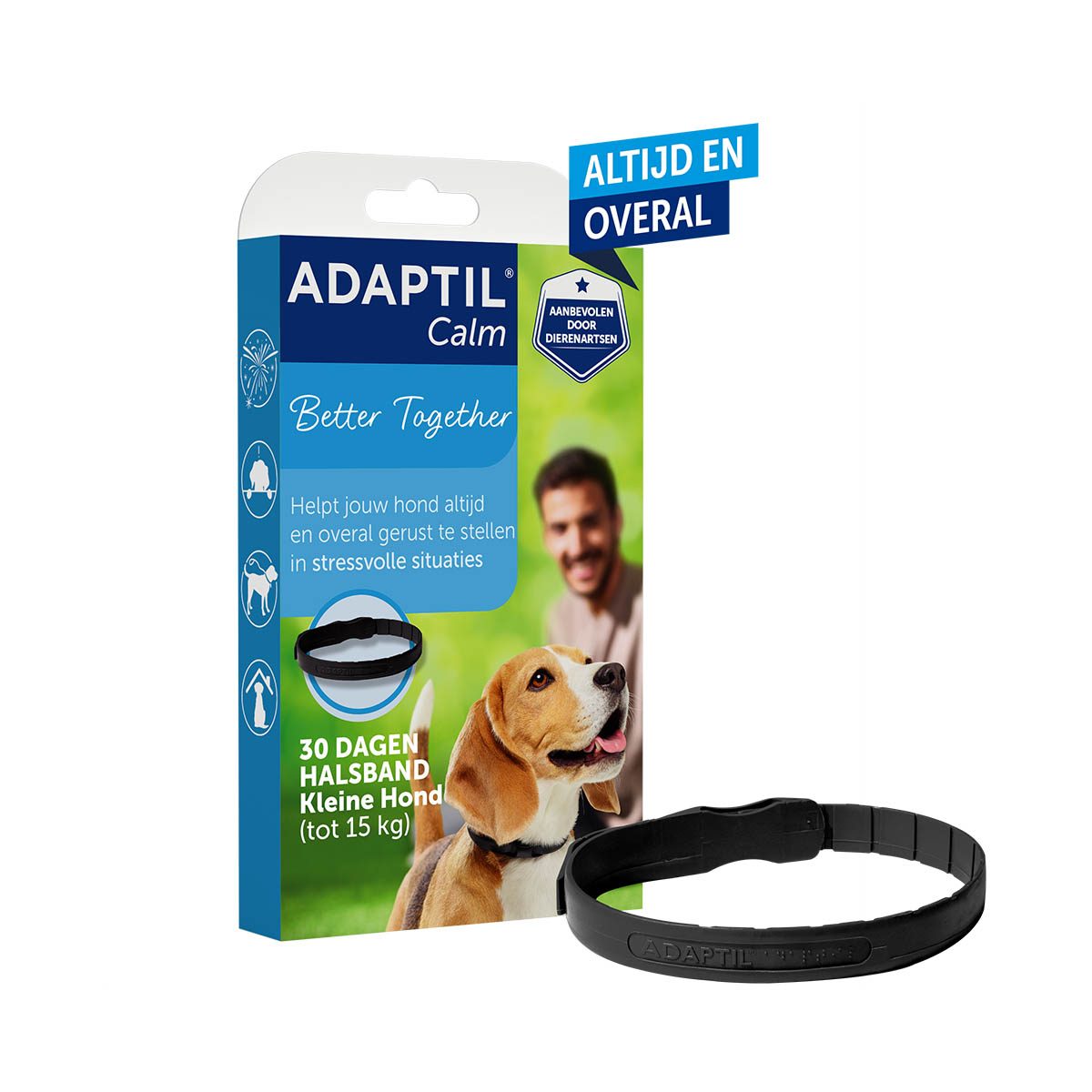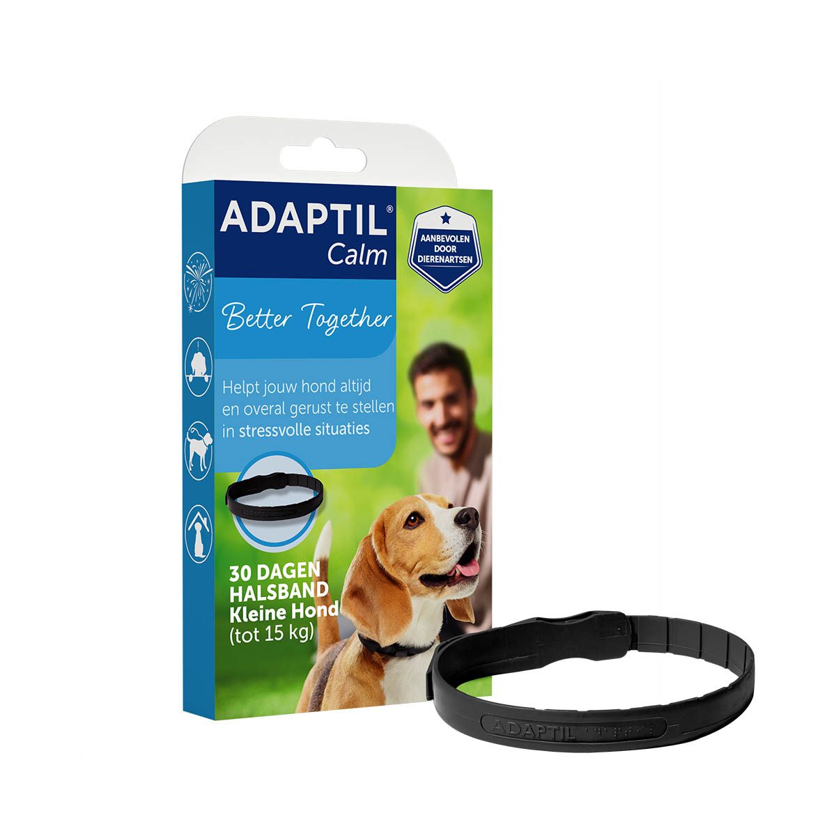 Adaptil Calm Rustgevende Halsband small/medium helpt honden gerust te stellen bij nieuwe ervaringen of bij situaties die bij hen angst oproepen en voor stress zorgen, zoals alleen thuisblijven, harde geluiden en visite. 1 halsband biedt 4 weken constante ondersteuning. De halsband maat S past rond een nek tot 37,5 cm, voor honden tot ongeveer 15 kg. De Adaptil halsband brengt jou en je hond dichter bij elkaar, door thuis een geruststellende omgeving te creëren. De halsband heeft een doorlopend effect en biedt constante geruststelling voor je hond. Het effect is klinisch bewezen en wordt aanbevolen door dierenartsen.