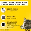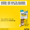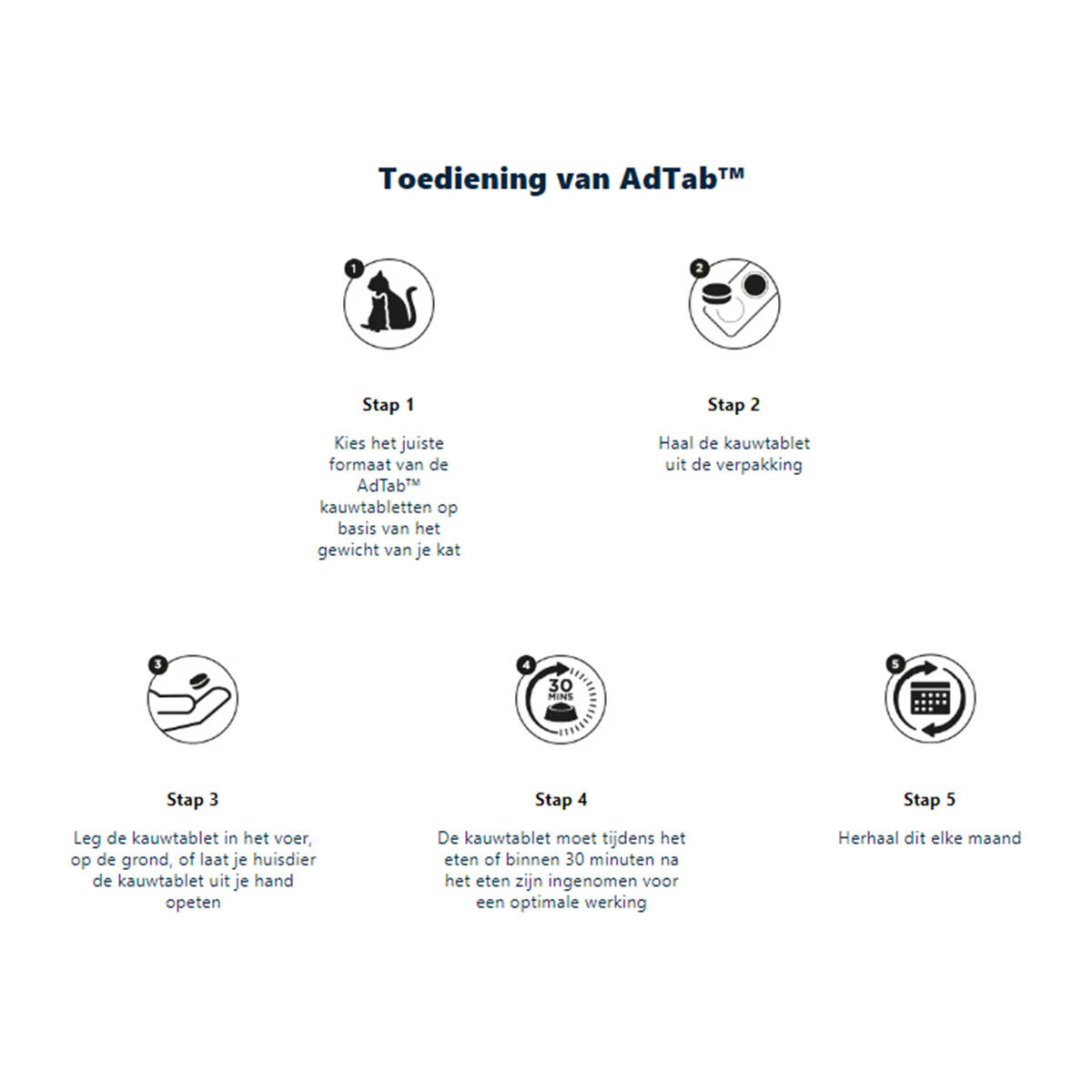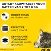 Kies het juiste kauwtablet op basis van het gewicht van je kat en geef je kat vervolgens één keer per 30 dagen AdTab™. Geef de tablet tijdens het eten of binnen 30 minuten na het eten voor een optimale werking. Het tablet kan eenvoudig met de hand gegeven worden of verstopt worden in een lekkernij.