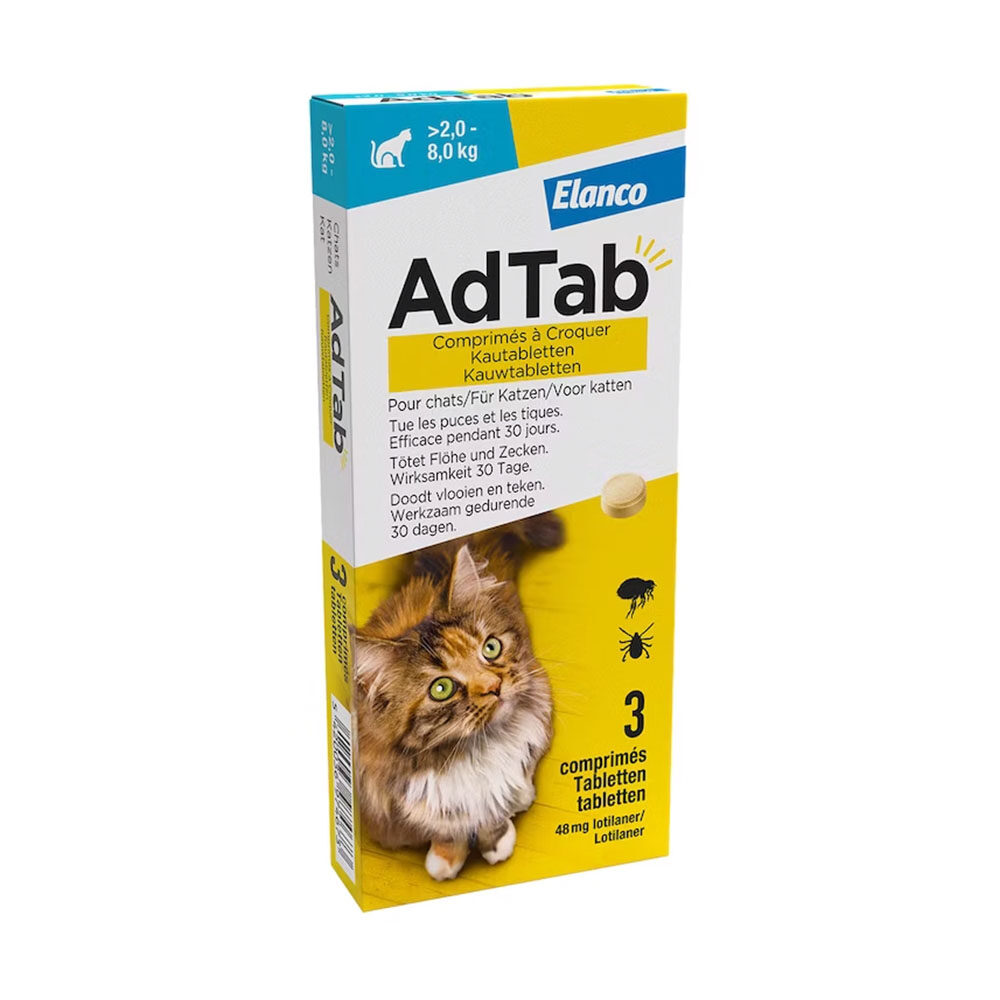 De tabletten zorgen ervoor dat aanwezige vlooien binnen 6 uur gedood worden, voor aanwezige teken is dit binnen 8 uur. De tabletten kunnen tijdens of binnen 30 minuten na het eten gegeven worden. De AdTab kauwtabletten zijn geschikt voor katten vanaf 8 weken en met een lichaamsgewicht vanaf 0,5 kg.
