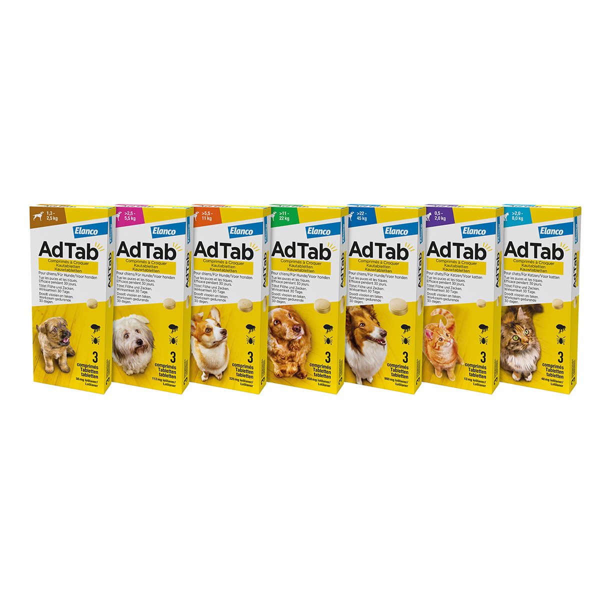 De tabletten zorgen ervoor dat aanwezige vlooien binnen 6 uur gedood worden, voor aanwezige teken is dit binnen 8 uur. De tabletten kunnen tijdens of binnen 30 minuten na het eten gegeven worden. De AdTab kauwtabletten zijn geschikt voor katten vanaf 8 weken en met een lichaamsgewicht vanaf 0,5 kg.