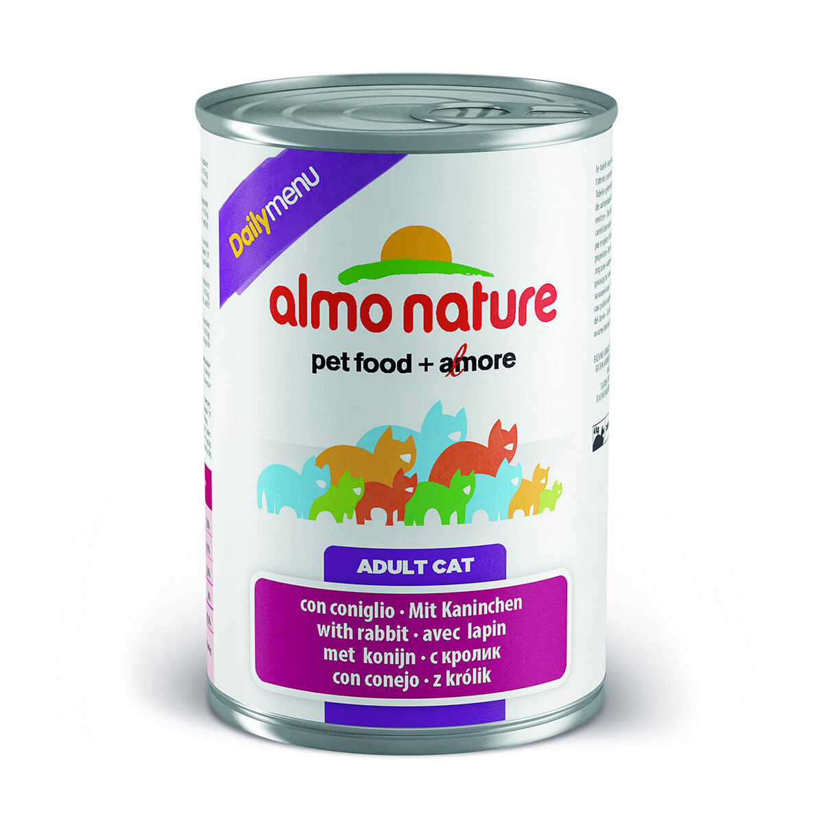 Almo Nature Dailymenu Cat Konijn 400gr. Daily menu is de kattenvoer lijn bereid met de beste verse ingrediënten, ideaal voor pet food recepten. Dankzij de gevarieerde premium ingrediënten (rood en wit vlees, vis, eieren, groenten en rijst) stellen we iedere kat zijn voorkeur tevreden. Compleet natuurlijke mousse, paté met heerlijke stukjes vrij van conserveermiddelen en kleurstoffen. Dailymenu bevat een selectie gecertificeerde biologische recepten: alle ingrediënten komen vanuit de biologische agricultuur.