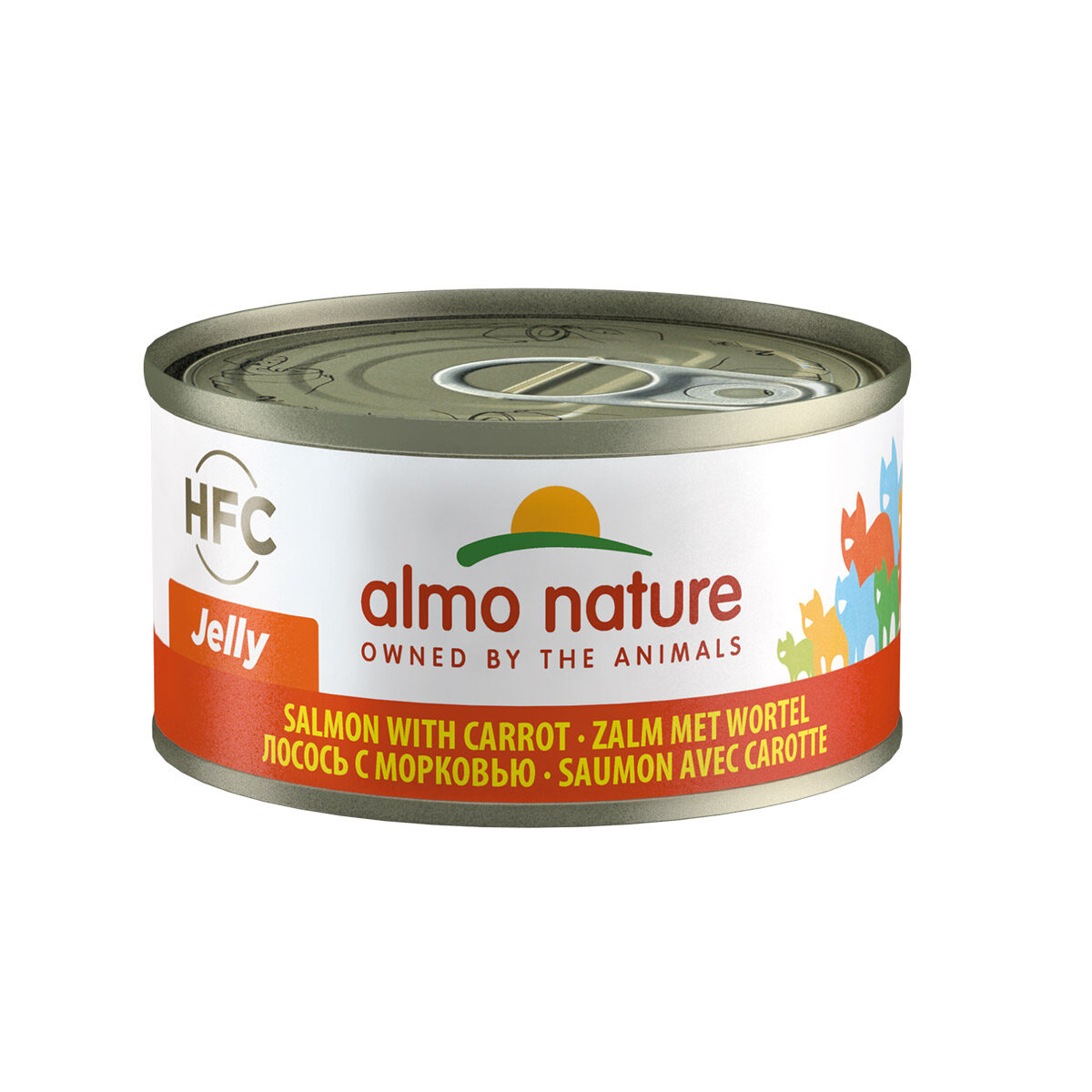 Almo Nature HFC Cat Jelly Zalm&Wortel 70gr. De legendarische Almo Nature kwaliteit is tegenwoordig nog transparanter: de HFC acroniem verklaart de herkomst van de ingrediënten in het recept, dat van origine geschikt is voor menselijke consumptie. Bereid met weinig ingrediënten en gewoon gekookt in bouillon of au bain marie, alle HFC recepten zijn ideaal om op natuurlijke wijze de kat te hydrateren, dankzij hun rijke bouillon.