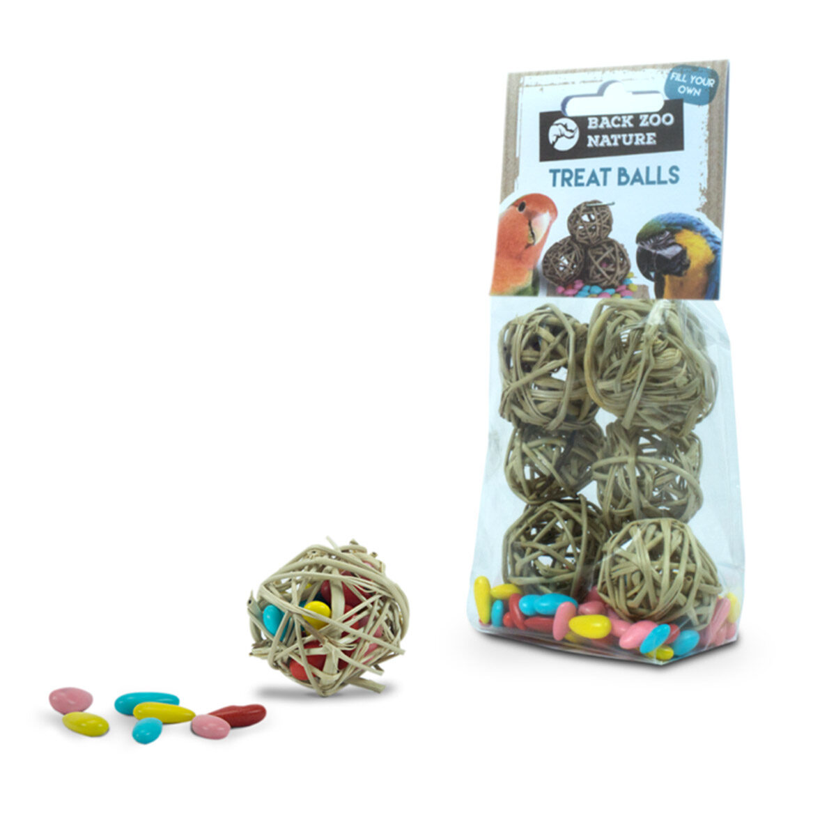 Back Zoo Nature Treat Ball Met Snoepjes 6 stuks. Deze natuurlijke gevlochten balletjes zijn ideaal om de Back Zoo Nature snoepjes in te verstoppen. In dit uitdagende speelgoed kun je ook zonnepitten en gedroogd fruit verstoppen. Met dit speelgoed kunnen jouw vogels zich goed flink vermaken. Geschikt voor kleine- en grote parkieten en papegaaien.