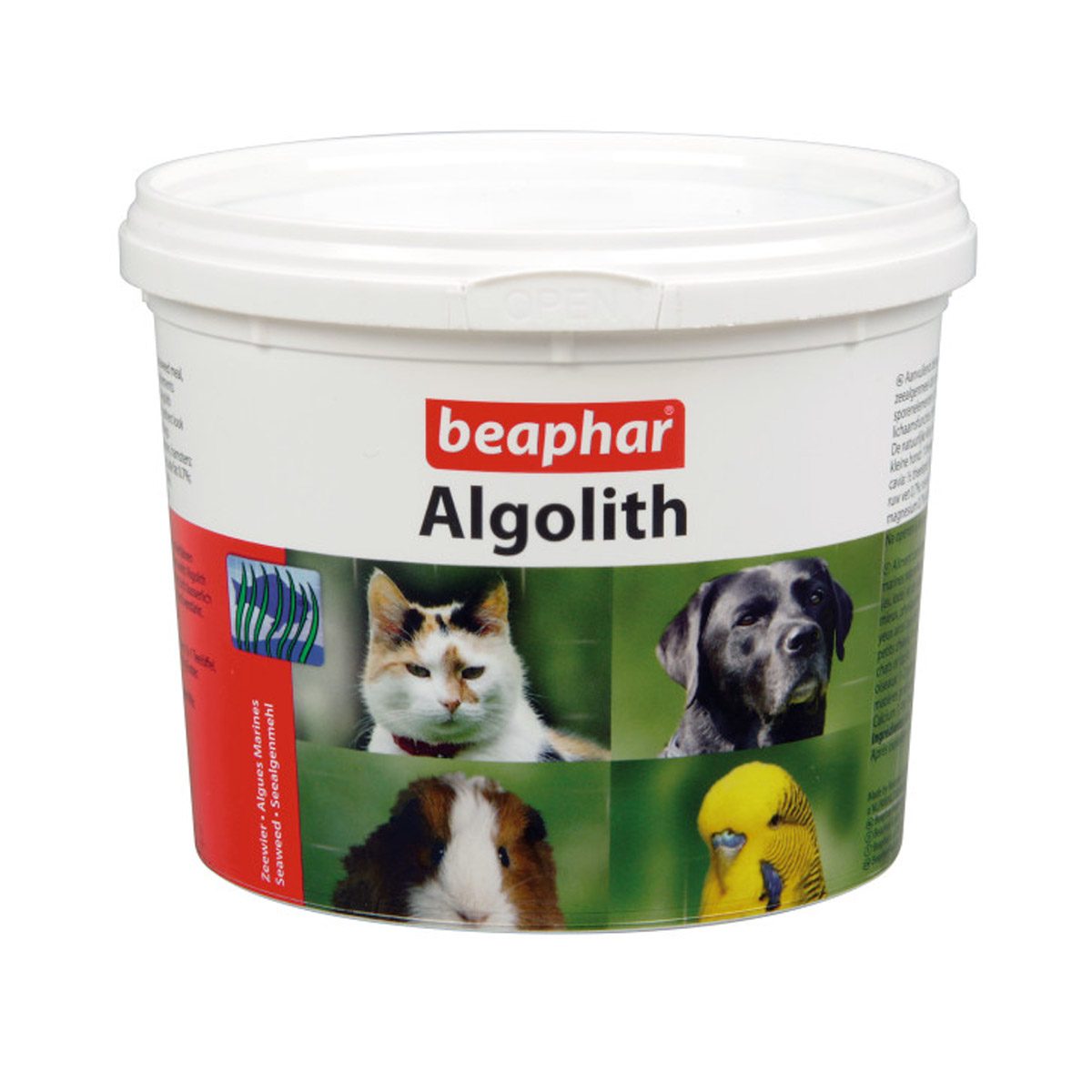 Beaphar Algolith Zeewier 500 gr. Algolith (zeewier) is een natuurlijk zeealgenmeel dat onder bijzondere omstandigheden bereid wordt. Het bevat een relatief hoog percentage sporenelementen (b.v. jodium) en vitaminen en heeft daardoor een bijzonder gunstige werking op alle lichaamsfuncties. Het dier voelt zich beter. Uiterlijk is dit te zien aan een betere haar-, veren- en huidconditie. De natuurlijke kleur van vacht, veren en ogen wordt versterkt. Een aanvullend diervoeder voor honden, katten, vogels en knaagdieren.