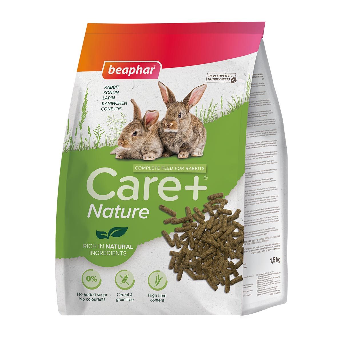 Beaphar Care+® Nature is een volledig graanvrij konijnenvoer met een hoog vezelgehalte en rijk aan natuurlijke ingrediënten. De speciaal geharde brokjes weerspiegelen de natuurlijke voeding van het konijn en ondersteunen de natuurlijke tandslijtage.