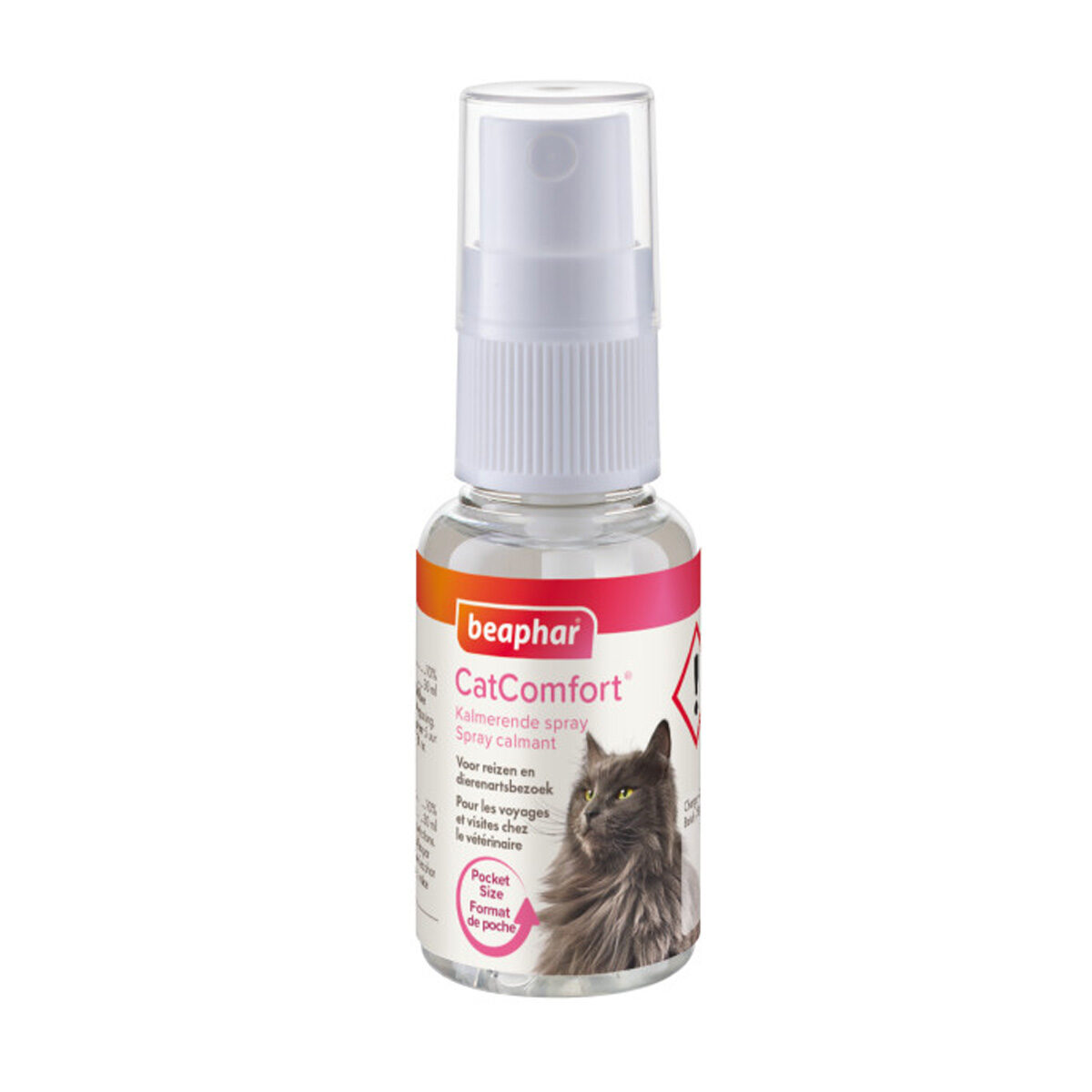 Beaphar CatComfort & Kalmerende Spray 60 ml. CatComfort van Beaphar maakt gebruik van feromonen. Hiervan is klinisch bewezen dat ze gevoelens van geruststelling bevorderen. Het vermindert zo de algemene angst veroorzaakt door stress rond het huis. Een kat kan zelf ook feromonen verspreiden. Dit doet hij als hij met zijn kop langs voorwerpen wrijft. Zo markeert de kat zijn territorium en ziet het als veilig en vertrouwd. Catcomfort maakt gebruik van deze geruststellende feromonen. Om je kat ook buitenshuis op een veilige manier gerust te stellen, is er Beaphar CatComfort Kalmerende Spray. Deze spray is ideaal voor de preventie van stressvolle situaties en gedragsproblemen.