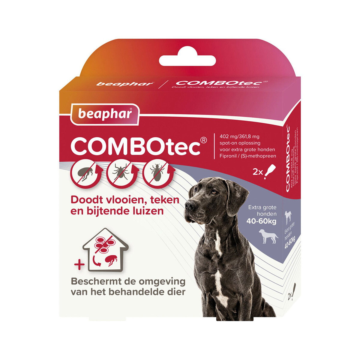 Beaphar COMBOtec hond 40-60 kg 2 pipetten, bevat een combinatie van fipronil en (S)-methopreen (een insecten groeiregulator). Hierdoor is een vlooienplaag sneller onder controle. COMBOtec doodt vlooien gedurende 8 weken én voorkomt gedurende die periode nieuwe vlooien in de omgeving door de ontwikkeling van eieren, larven en poppen tegen te gaan. Doodt teken gedurende 4 weken. Doodt bijtende luizen. Geschikt voor honden met een gewicht van 2-10kg en een leeftijd vanaf 8 weken. Veilig te gebruiken tijdens dracht en lactatie.