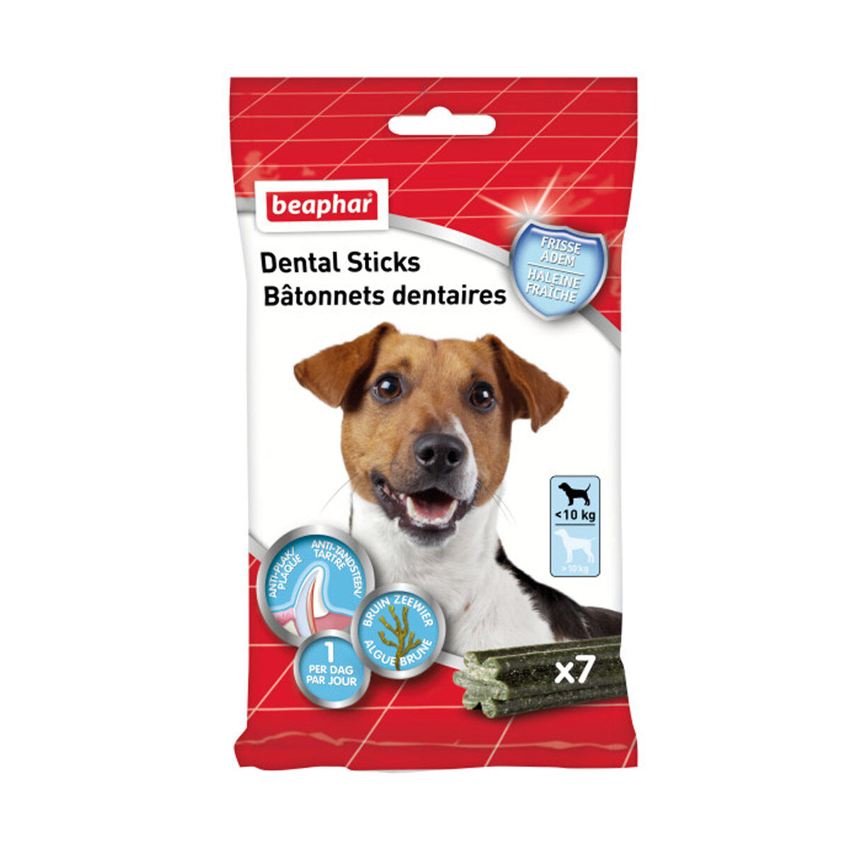 Smakelijke Beaphar Dental Sticks met bruin zeewier, spirulina en groene thee voor dagelijkse gebitsverzorging. Bruin zeewier: Verwijdert de onderliggende oorzaken van tandplak, zelfs nadat de stick is opgegeten. Groene thee extract: Zorgt voor een frisse adem door slechte geuren te neutraliseren. De unieke, stervormige sticks bevatten spirulina. Ze stimuleren het natuurlijke reinigingsproces van de tanden door het kauwen, ook lang na inname. De sticks zijn vetarm, zonder kunstmatige smaak- en kleurstoffen. Beaphar Dental Sticks zijn ook verkrijgbaar voor honden vanaf 10 kg.