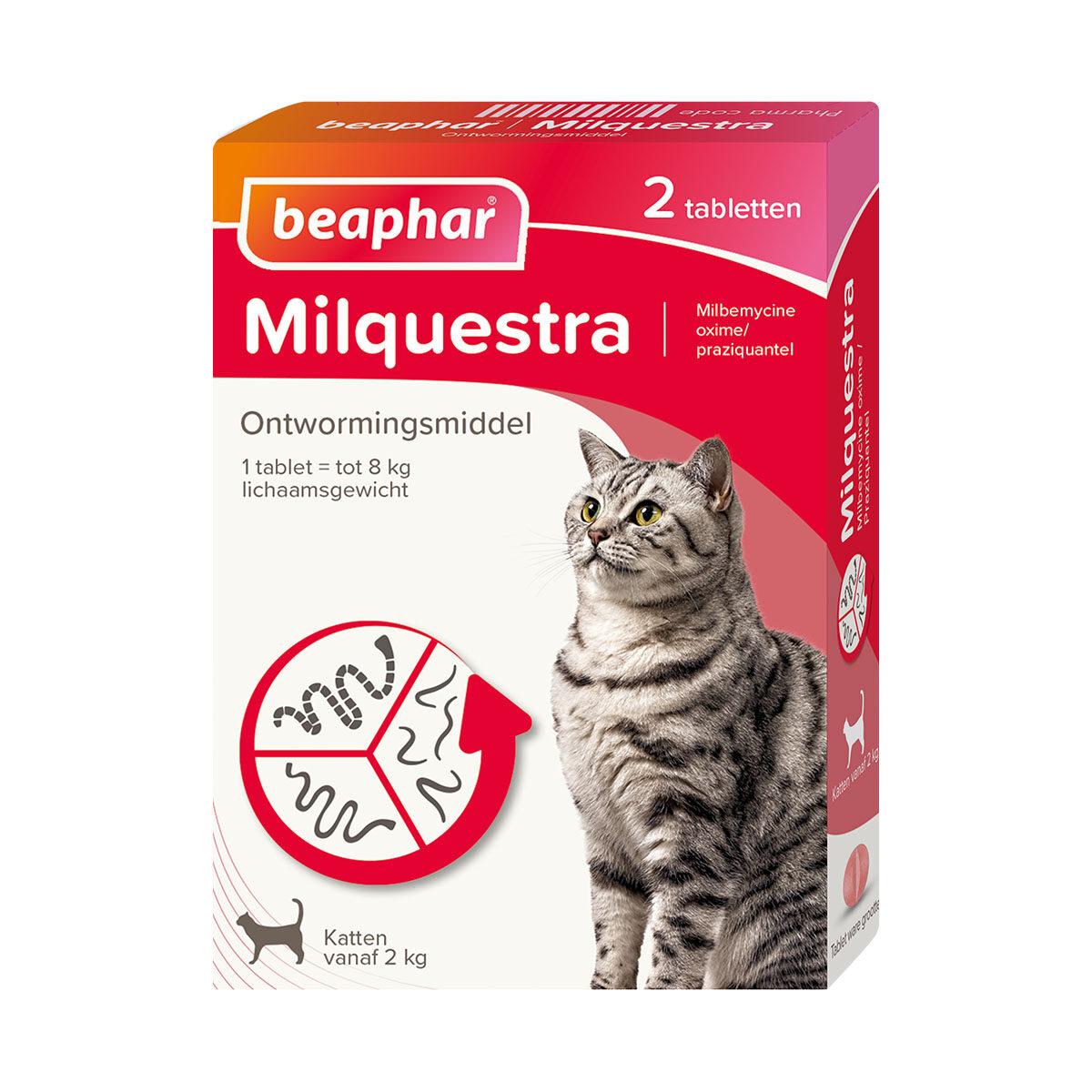Beaphar Milquestra Kat 2 - 12 kg 2 Tabletten. Milquestra wormtabletten kat is een breedspectrum ontwormingsmiddel voor katten vanaf 2kg op basis van Milbemycine oxime en Praziquantel. Werkzaam tegen: -Lintwormen (Dipylidium caninum, Taenia spp., Echinococcus multilocularis) -Haakwormen (Ancylostoma tubaeforme) -Spoelwormen (Toxocara cati) -Hartwormziekte (Dirofilaria immitis), preventieve behandeling