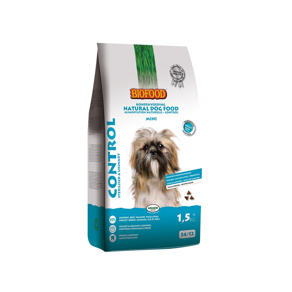 Biofood Control Small Breed 1,5 kg. Biofood control mini is hoogwaardige volledige natuurlijke smaakvolle hondenvoeding voor volwassen honden van kleine rassen, ter ondersteuning van urinewegen (blaasgruis / stenen / struviet) en bij overGewicht: (bijv. sterilisatie). 65% kip, rund, zalm, rijst en erwten. Met prebiotica FOS (inuline) en zalmolie. Tarwevrij. Optimale brokgrootte, -vorm en -structuur. Beperkt caloriegehalte en een aangepaste verhouding mineralen. Helpt de pH van de urine te regelen en kan helpen bij het verminderen van struvietsteenvorming. Ondersteunt de urinewegen, huid en vacht, gebit en helpt het Gewicht: te behouden of te verminderen. Inuline FOS (prebiotica) stimuleert de darmflora en ondersteunt hiermee de gezondheid. Beperkt geur en volume van de ontlasting. Gezonde voeding die zorgt voor een optimale vertering, ontlasting en een goede conditie van je hond. Biofood Control Small Breed is ook verkrijgbaar in een verpakking van 10 kg.