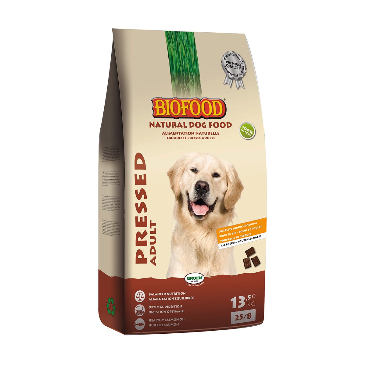 Biofood Geperst Adult 13,5 kg. Biofood geperst adult is van Nederlandse topkwaliteit. Hoogwaardige natuurlijke grondstoffen. Volledige geperste hondenvoeding voor volwassen honden. 56% rund, kip, wild zwijn, vis en rijst. Met zalmolie en natuurkruiden. Rijk aan Omega 3 & 6 vetzuren. Hoge acceptatie en verteerbaarheid. Lage maagbelasting en verhitting van de brok. Ideaal voor kieskeurige en moeilijke eters. Zonder chemische toevoegingen. Optimale voeding die zorgt voor een betere vertering, ontlasting en een goede conditie van je hond. Voor alle hondenrassen.
