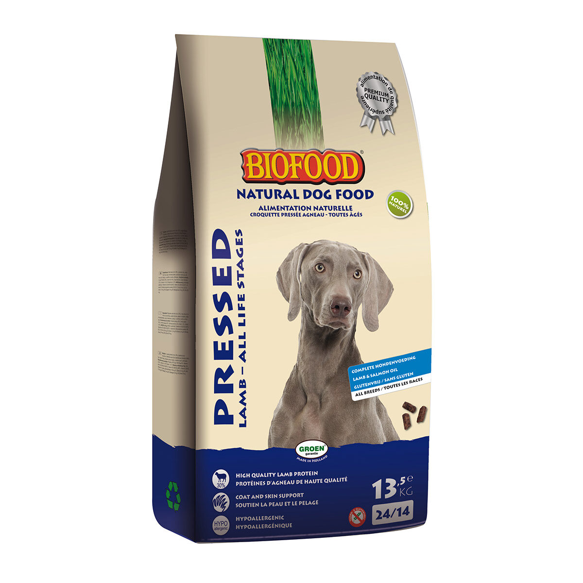 Biofood Geperst Lam 13,5 kg. Biofood Geperst Lam is van Nederlandse topkwaliteit. Met hoogwaardige natuurlijke grondstoffen. Volledige zeer goed verteerbare geperste all life stage hondenvoeding. 50% lam, rijst en zalmolie. Met essentiële omega 3 en 6 vetzuren en kruiden. Hypoallergeen (1 dierlijke eiwitbron) en tarwe- en glutenvrij. Hoge acceptatie en verteerbaarheid. Voor voedingsgevoelige en/of kieskeurige honden en moeilijke eters. Lage maagbelasting en verhitting van de brok. Zonder chemische toevoegingen. Optimale voeding die zorgt voor een betere vertering, ontlasting en een goede conditie van je hond. Voor alle hondenrassen.