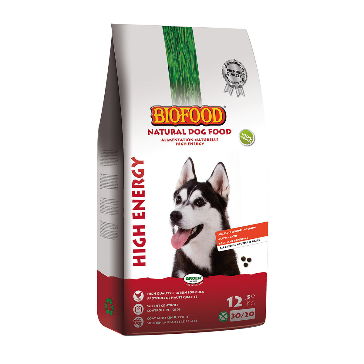 Biofood High Energy&Super Premium 12,5 kg. Biofood High Energy krokante brokken is van Nederlandse topkwaliteit. Hoogwaardige natuurlijke grondstoffen. Volledige licht verteerbare geëxtrudeerde hondenvoeding voor volwassen honden. 63% kip, maïs en zalmolie. Tarwevrij. Hoge acceptatie en verteerbaarheid. Met lijnzaad en kruiden. Eiwit/vet (30/20). Energierijke voeding. Voor jacht-, training en sporthonden, jonge honden van grote hondenrassen, voor de dracht- en zoogperiode en voor honden die in conditie moeten komen na een ziekte. Optimale voeding die zorgt voor een betere vertering, ontlasting en een goede conditie van je hond. Zonder chemische toevoegingen. Voor alle hondenrassen.