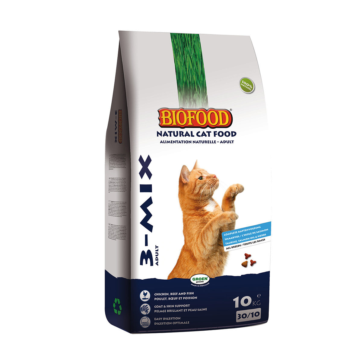 Biofood Kattenbrokjes 3-Mix 10 kg. Biofood kat 3-mix is met grote zorg bereid met natuurlijk geselecteerde ingrediënten. Deze kattenbrokken met kip, rund en vis zijn geschikt voor volwassen katten. Biofood kat 3-mix bevat de optimale dagelijkse hoeveelheid eiwitten, vetten, koolhydraten, vitaminen en mineralen die bijdragen tot een goede gezondheid van je kat. Biofood kat 3-mix voeding is verrijkt met taurine, echinacea kruiden en bevat gezonde omega 3 en 6 vetzuren.