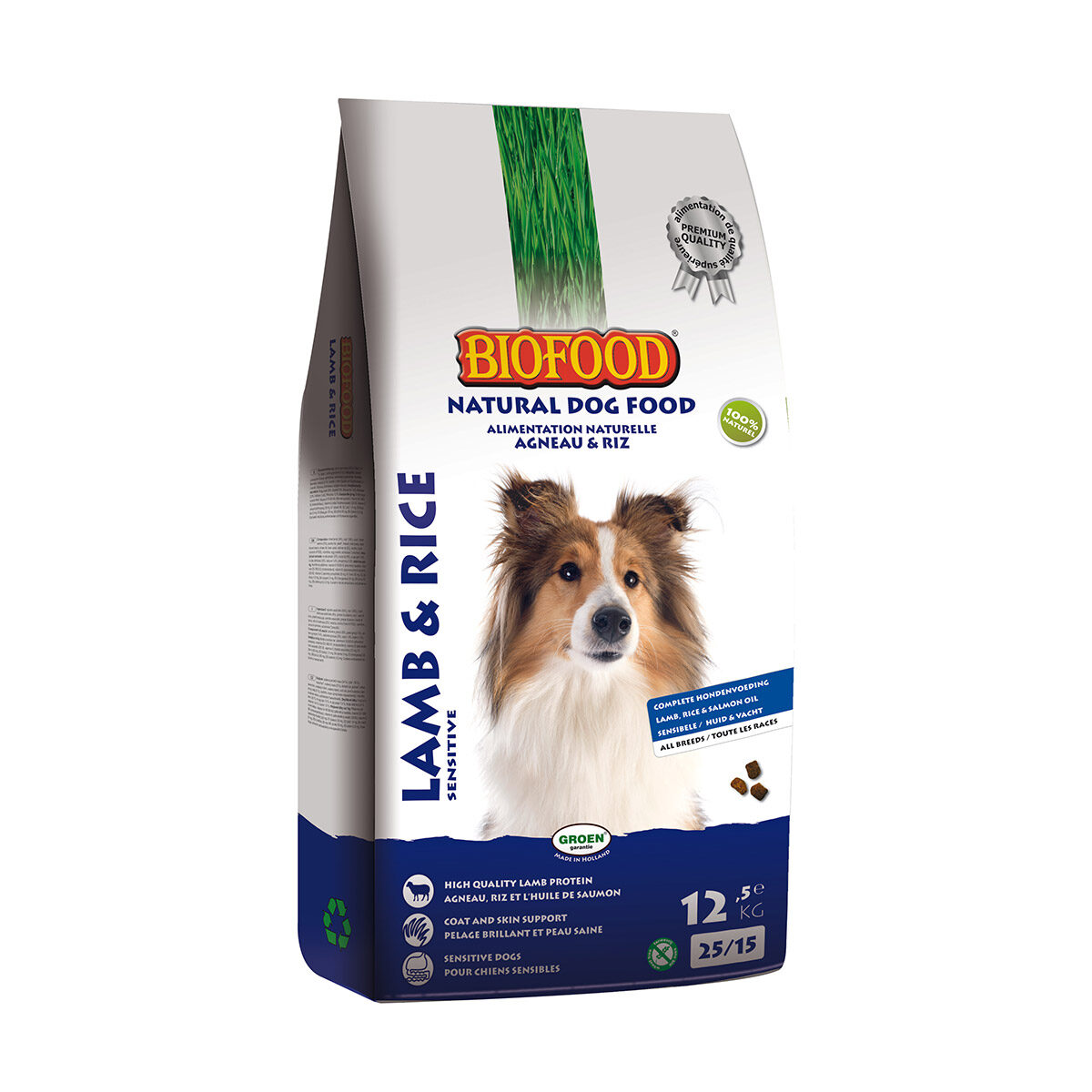 Biofood Lam & Rijst 12,5 kg. Biofood lam & rijst brokken zijn van Nederlandse topkwaliteit. Met hoogwaardige natuurlijke grondstoffen. Volledige licht verteerbare hondenvoeding voor volwassen honden. 60% lam, zalm en rijst. Met schapenvet, essentiële omega 3 en 6 verzuren en kruiden. Tarwevrij. Hoge acceptatie en verteerbaarheid. Voor voedingsgevoelige en/of kieskeurige honden en moeilijke eters. Lijnzaad kan een verzachtende werking hebben bij allergieën. De toegevoegde echinacea kruiden ondersteunen het afweersysteem. Zonder chemische toevoegingen. Optimale voeding die zorgt voor een betere vertering, ontlasting en een goede conditie van jouw hond. Voor alle hondenrassen.