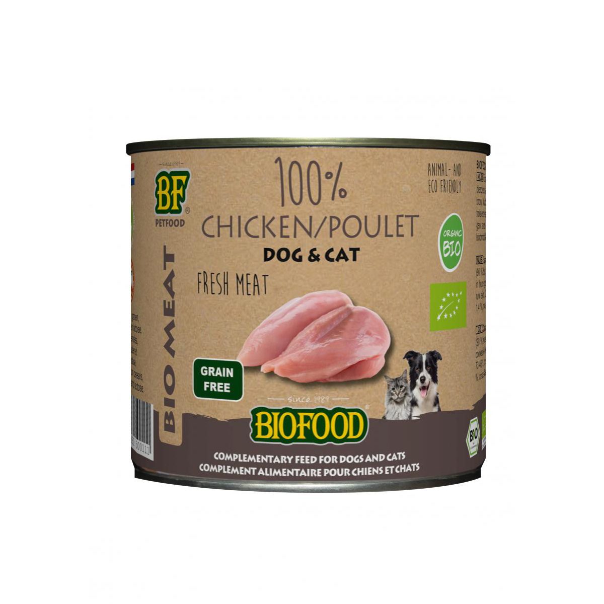 Biofood Organic 100% Kippenvlees Blik 200gr. Biofood Organic vleesvoeding: kan als aanvullend of complete voeding gegeven worden voor jouw hond en/of kat. Het is geschikt voor kittens/pups tot aan senioren. Biofood Organic 100% Kippenvlees bevat slechts één eiwitbron waardoor het geschikt is voor gevoelige honden en katten. Het voer is verwarmd op een gecontroleerde lage temperatuur (waarvan 100% varianten in eigen vocht). Het meest natuurlijke en het beste voer voor kat en hond.