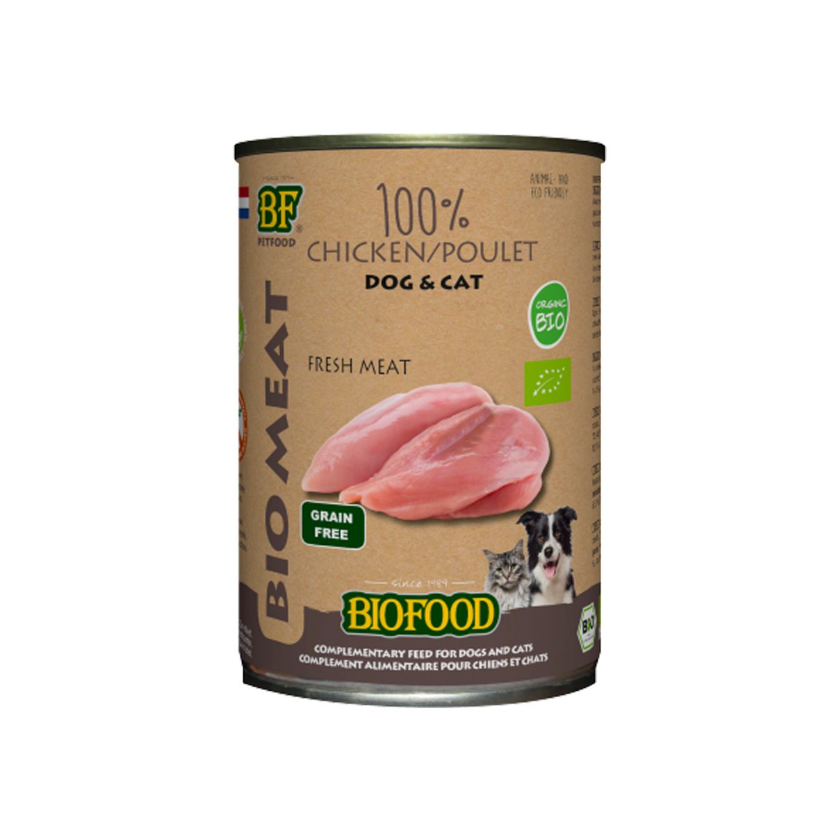 Biofood Organic 100% Kippenvlees Blik 400gr. Biofood Organic vleesvoeding: kan als aanvullend of complete voeding gegeven worden voor jouw hond en/of kat. Het is geschikt voor kittens/pups tot aan senioren. Biofood Organic 100% Kippenvlees bevat slechts één eiwitbron waardoor het geschikt is voor gevoelige honden en katten. Het voer is verwarmd op een gecontroleerde lage temperatuur (waarvan 100% varianten in eigen vocht). Het meest natuurlijke en het beste voer voor kat en hond.