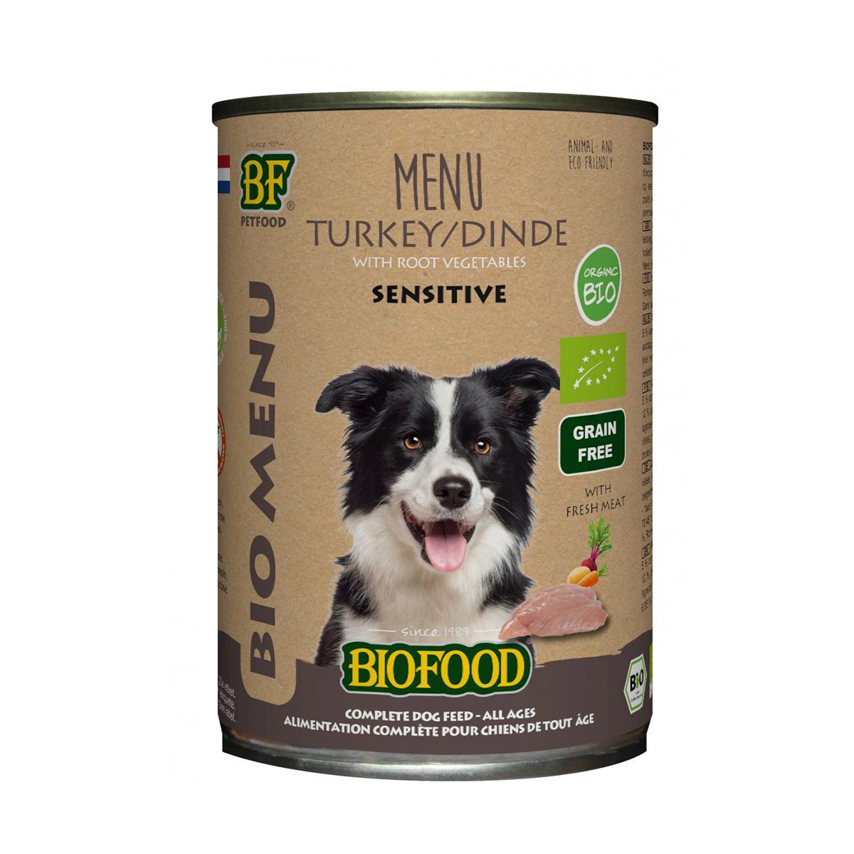 Biofood Organic Kalkoen Menu Blik 400gr. Biofood Organic vleesvoeding: kan als aanvullend of complete voeding gegeven worden voor jouw hond en/of kat. Het is geschikt voor kittens/pups tot aan senioren. Biofood Organic Kalkoen Menu bevat slechts één eiwitbron waardoor het geschikt is voor gevoelige honden en katten. Het voer is verwarmd op een gecontroleerde lage temperatuur (waarvan 100% varianten in eigen vocht). Het meest natuurlijke en het beste voer voor kat en hond.