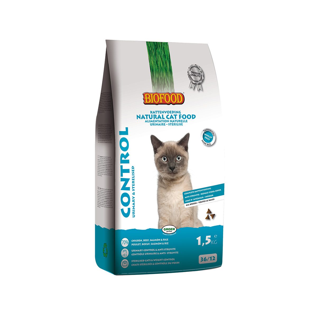 Biofood Premium Control Urinary-Sterilised 1,5 kg. Biofood control is een hoogwaardige, volledige, natuurlijke kattenvoeding die ontwikkeld is voor volwassen katten. Het kattenvoer helpt ter ondersteuning van de urinewegen en bij overgewicht (bijv. sterilisatie). Regelt de pH van de urine (in de richting van <6.5) en vermindert de hoeveelheid struvietvormende mineralen. Kan volgziekten zoals blaasontsteking voorkomen. Reduceert geur en volume van de ontlasting en bevat geen kunstmatige toevoegingen. Biofood Premium Control Urinary-Sterilised bevat 70% kip, rund, zalm en rijst.