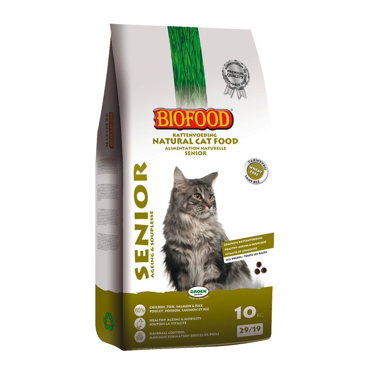 Biofood Premium Senior Ageing 10 kg. Biofood senior is een hoogwaardige, volledige, natuurlijke kattenvoeding die is ontwikkeld voor oudere katten en katten met gevoelige nieren. Het droogvoer met prebiotica FOS (inuline), omega 3 en 6 vetzuren, chondroïtine, glucosamine en taurine ondersteunt de mobiliteit, veroudering, nieren, gewicht, huid, vacht en zorgt voor een vermindering van haarbalvorming. Jouw oudere kat zal smullen van dit droogvoer dat 60% kip, vis, zalm en rijst bevat.