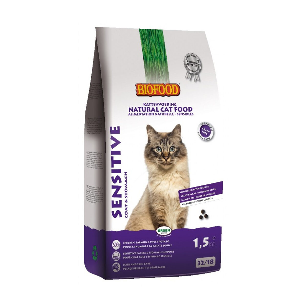 Biofood Premium Sensitive Coat&Stomach 1,5 kg. Biofood sensitive is een hoogwaardige, volledige, natuurlijke, graanvrije kattenvoeding die ontwikkeld is voor voedingsgevoelige en/of kieskeurige katten. Het bevat 60% kip, zalm en zoete aardappel. Het graanvrije droogvoer is verrijkt met zalmolie, omega 3 en 6 vetzuren, chondroïtine, glucosamine en taurine.