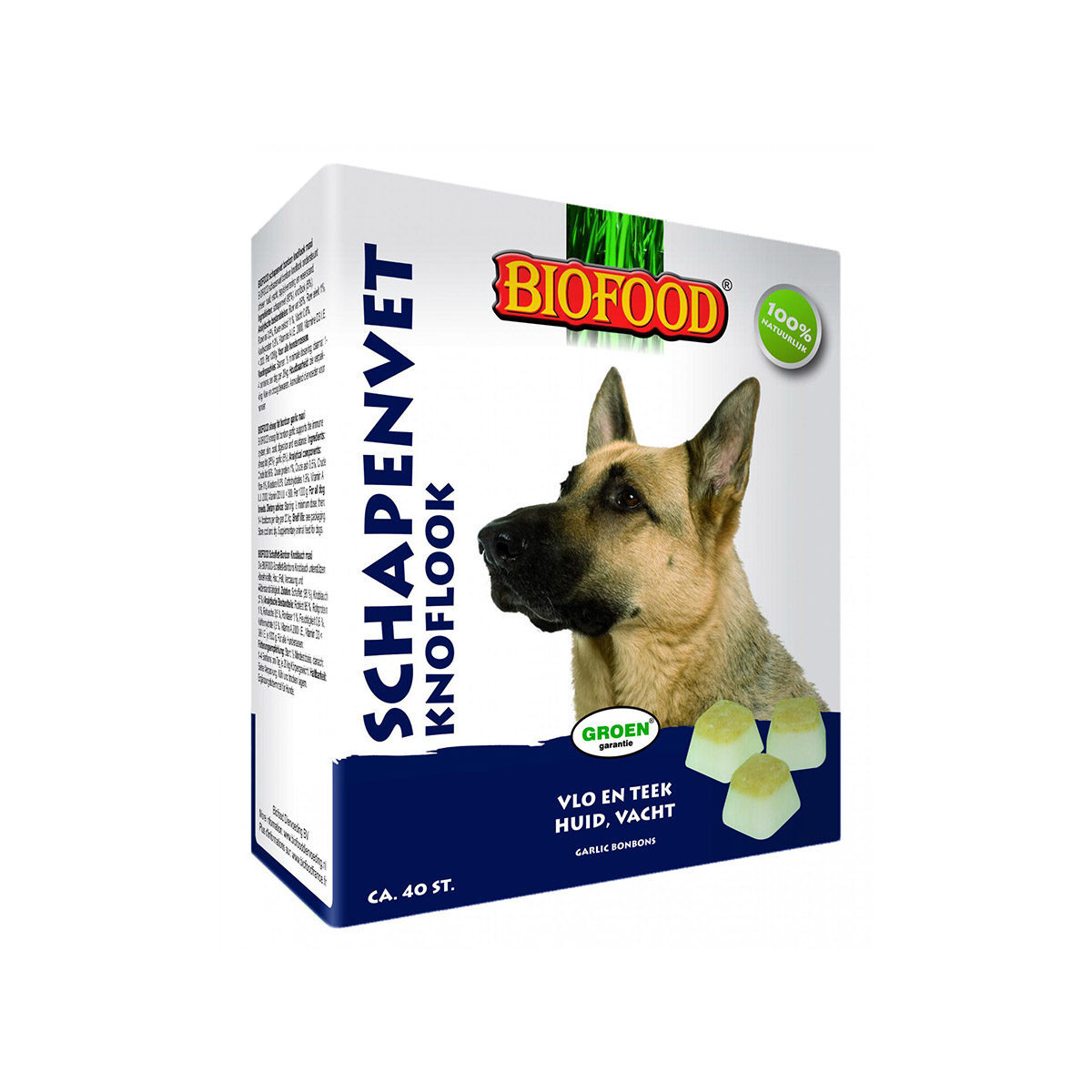 Biofood Schapenvet Maxi Knoflook 40 st is een natuurlijk en bijzonder probaat middel ter ondersteuning van afweer, huid, vacht, (spijs)vertering en weerstand. Dit product heeft een afwerende werking tegen vlooien en teken en is goed voor de vertering, huid en vacht. Het is tevens een uitzonderlijk gezonde en smaakvolle toevoeging op de dagelijkse voeding. Biofood Schapenvet Maxi Knoflook 40 st is ook geschikt voor honden met een voedselallergie die een dieet krijgen op basis van lamsvlees.