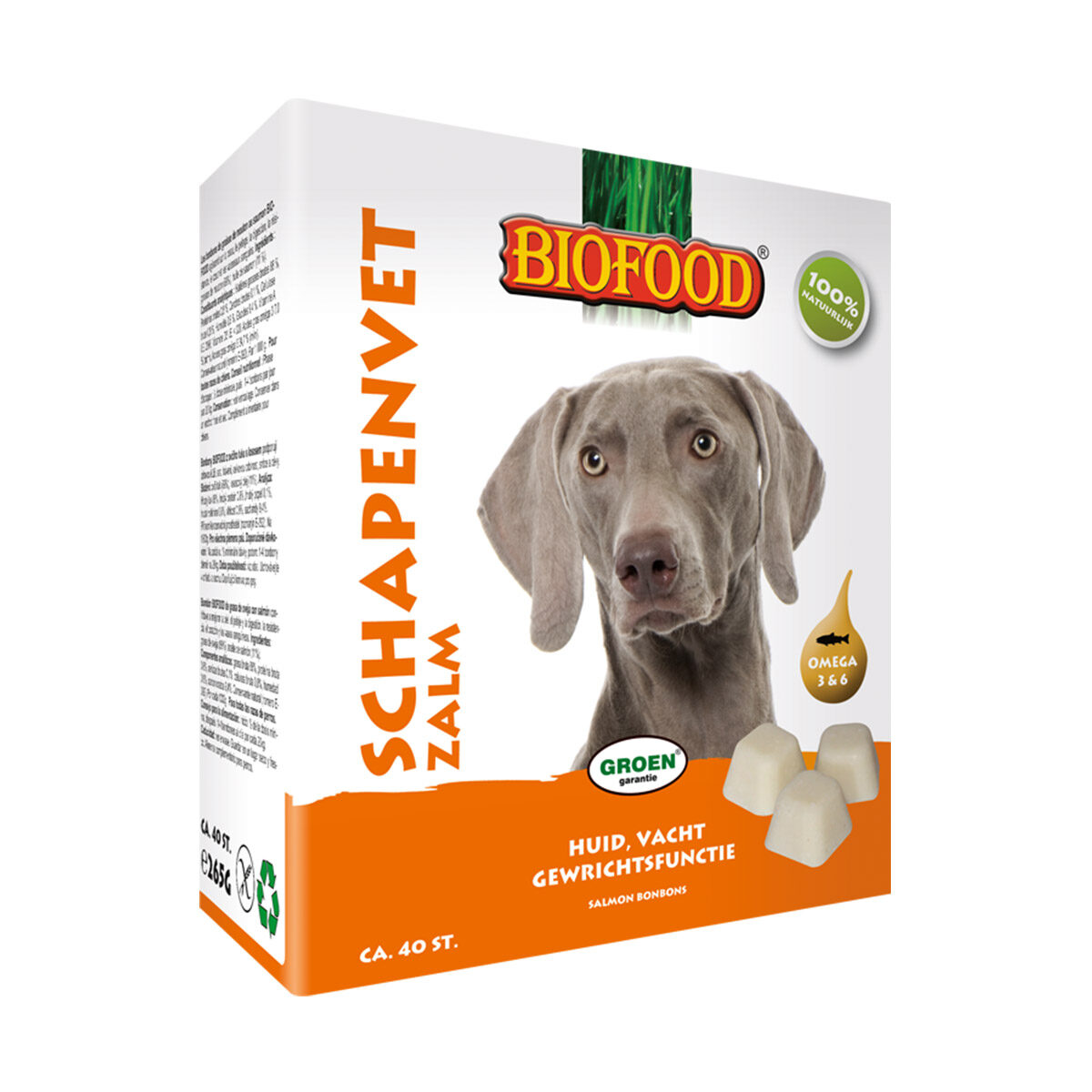 Biofood Schapenvet Maxi Zalm 40 st is een natuurlijk en bijzonder probaat middel ter ondersteuning van huid, vacht, (spijs)vertering en weerstand. Het is tevens een uitzonderlijk gezonde en smaakvolle toevoeging op de dagelijkse voeding. Biofood Schapenvet Maxi Zalm 40 st is rijk aan omega 3 en 6 vetzuren. Het ondersteunt huid, vacht, hart en bloedvaten. Daarnaast is het ook geschikt voor honden met een voedselallergie die een dieet krijgen op basis van lamsvlees. De bonbons zijn een gezonde toevoeging op de dagelijkse voeding.