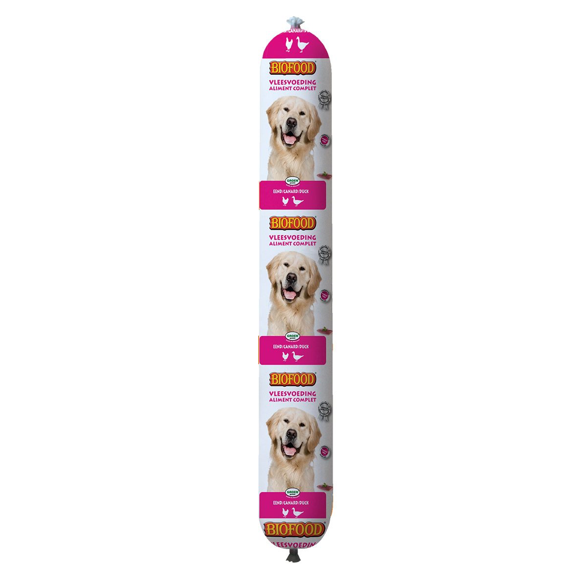 Biofood Vleesvoeding Compleet Eend 800 gram. Biofood vleesvoeding is een natuurlijke, complete en houdbare hondenvoeding op basis van vers vlees, vis, orgaanvlees, rijst, schapenvet en natuurkruiden. Is uitermate geschikt voor vleesdagen, als traktatie, voor onderweg, smaakmaker, bij omschakeling naar ander voer of voor honden die slecht reageren op droogvoeding. Geschikt voor iedere hond, van pup tot senior. Handige 800 gram worst.