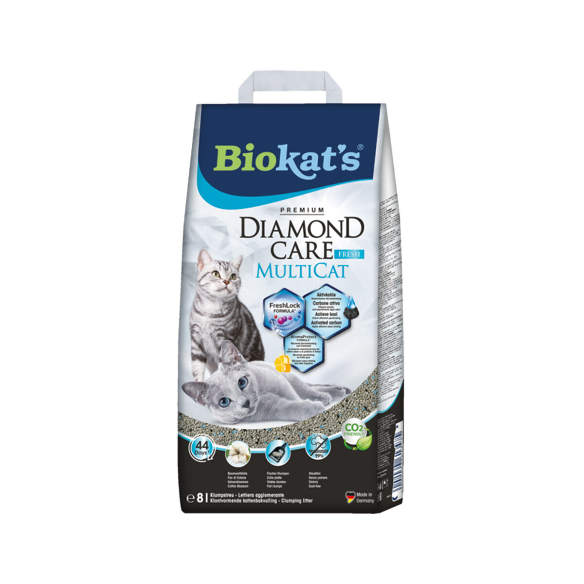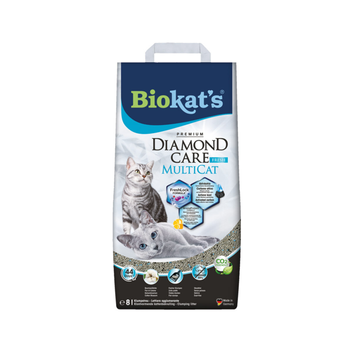 Biokat's Kattenbakvulling Multi Cat 8L. Met meerdere katten in huis kan het schoonhouden van de kattenbak best een uitdaging zijn. Diamond Care MultiCat van Biokat's is speciaal ontwikkeld voor huishoudens met meerdere katten. Dit effectieve kattengrit bevat actieve kool, dat wordt gemaakt van kokosnootschalen. De actieve kool zorgt voor een maximale geurbinding en tegelijkertijd voor een fris ruikende en hygiënische kattenbak. De absorberende kracht van de actieve kool zorgt voor de vorming van stevige klonten grit, die gemakkelijk te verwijderen zijn.