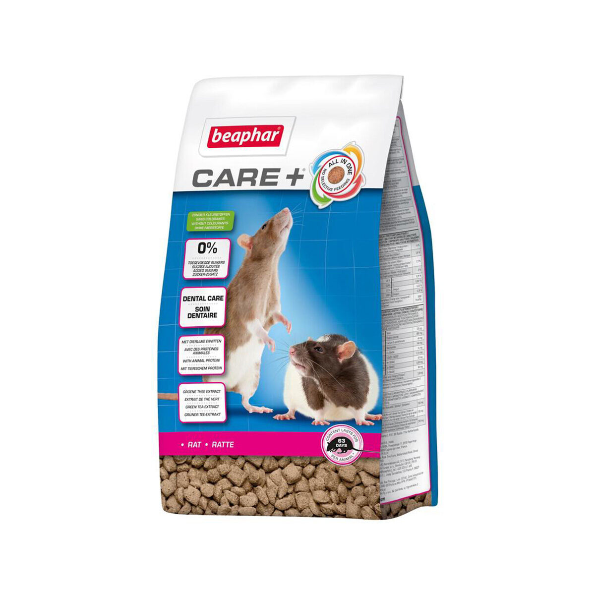 Care+ Rat is een zeer smaakvolle en uitgebalanceerde voeding . Het is ontwikkeld in samenwerking met dierenartsen en voedingsdeskundigen. Care+ Rat is geëxtrudeerd, deze hittebehandeling maakt een betere vertering van eiwitten uit het voer mogelijk en maakt de brokjes extra krokant. De ingrediënten zijn afgestemd op de voedingsbehoefte en benaderen het natuurlijke voedingspatroon. Ieder brokje heeft dezelfde samenstelling (All-in-One), met als resultaat: geen selectief eetgedrag, dus geen restjes en geen tekort aan essentiële voedingsstoffen. De harde brokjes ondersteunen de natuurlijke slijtage van de tanden (Dental Function). De brokjes bevatten verder een uitgebalanceerde verhouding van de meervoudig onverzadigde vetzuren Omega 3 & Omega 6 (uit maïs, tarwe, soja en vlaszaad), met vitamine E voor de lichaamscellen, met dierlijke eiwitten en smakelijke kruiden. Met Care+ Rat heb je absoluut het beste voor jouw rat in handen.