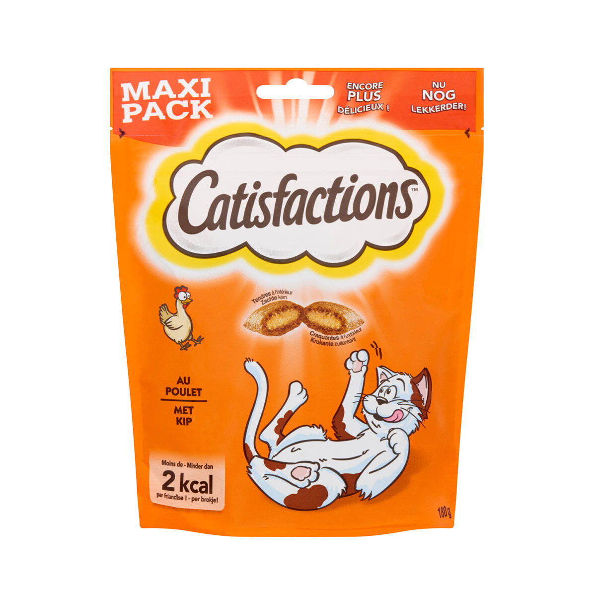 Catisfactions Kip 180gr. Catisfactions zijn kattensnoepjes met een krokante buitenkant en een heerlijke vulling van kip of zalm. Geschikt als tussendoortje of als beloning voor de kat.