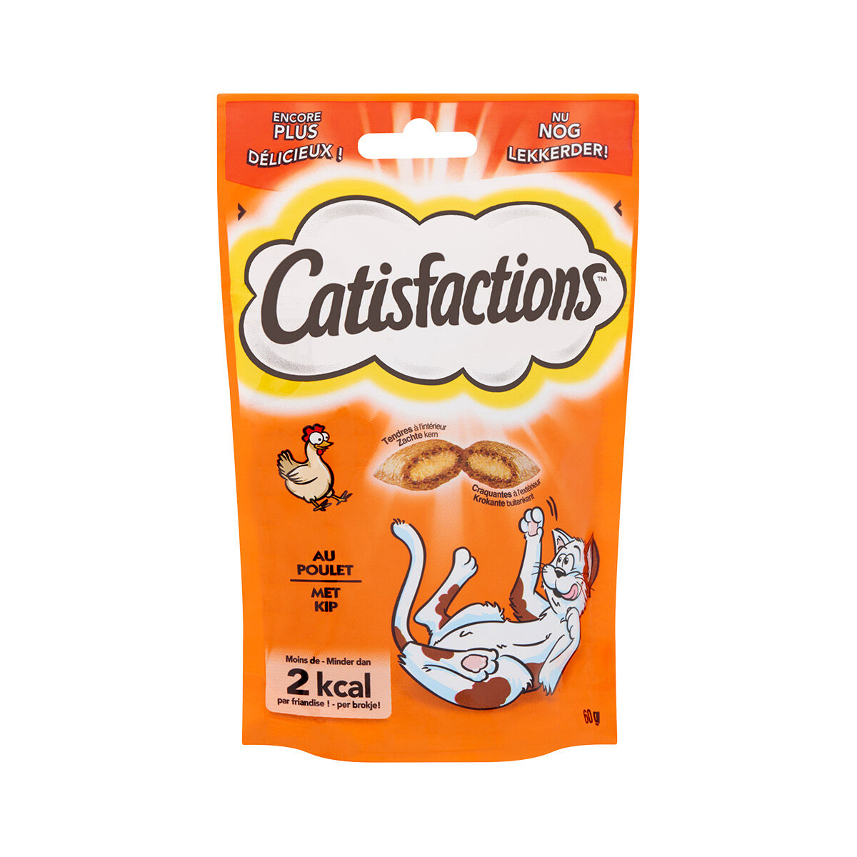 Catisfactions Kip 60 gr. Catisfactions is een heerlijke, gezonde en krokante kattensnack. De brokjes zijn gevuld met een smakelijke vulling van kip. Dankzij deze heerlijke vulling zijn de Catisfactions onweerstaanbaar voor jouw kat. De brokjes zijn ook nog eens verantwoord met minder dan 2 calorieën per brokje.
