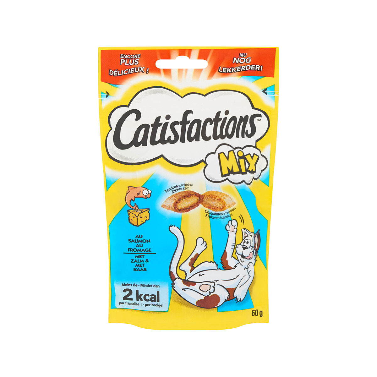 Catisfactions Zalm&Kaas 60 gr. Catisfactions is een heerlijke, gezonde en krokante kattensnack. De brokjes zijn gevuld met een smakelijke vulling van zalm&kaas. Dankzij deze heerlijke vulling zijn de Catisfactions onweerstaanbaar voor jouw kat. De brokjes zijn ook nog eens verantwoord met minder dan 2 calorieën per brokje.