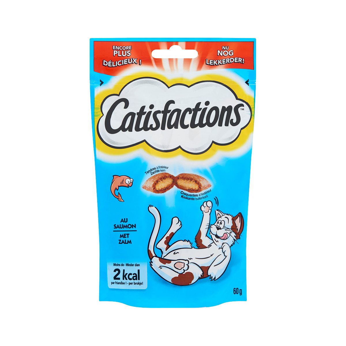 Catisfactions Zalm 60 gr. Catisfactions is een heerlijke, gezonde en krokante kattensnack. De brokjes zijn gevuld met een smakelijke vulling van zalm. Dankzij deze heerlijke vulling zijn de Catisfactions onweerstaanbaar voor jouw kat. De brokjes zijn ook nog eens verantwoord met minder dan 2 calorieën per brokje.