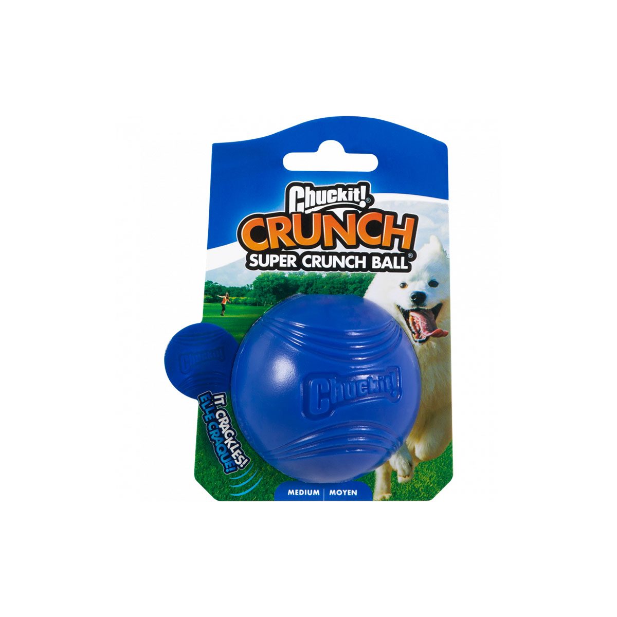 Chuckit Super Crunch Ball. Met de gave Chuckit Super Crunch Ballen speelt u goed in op de natuurlijke instinctieve nieuwsgierigheid naar geluiden! In de kern van de ballen zit namelijk materiaal verwerkt, dat tijdens het spelen en apporteren kraakt en knispert. Hierdoor wordt de interesse van de hond in de bal verhoogd. Daarnaast is de Super Crunch bal gemaakt van duurzaam TPR, wat ze uitzonderlijk sterk maakt, en zorgt de donkerblauwe kleur ervoor dat de bal goed zichtbaar is in hoog gras en andere omgevingen. De bal is 6 cm groot, waardoor de bal te gebruiken is met alle Chuckit Launchers in maat medium.