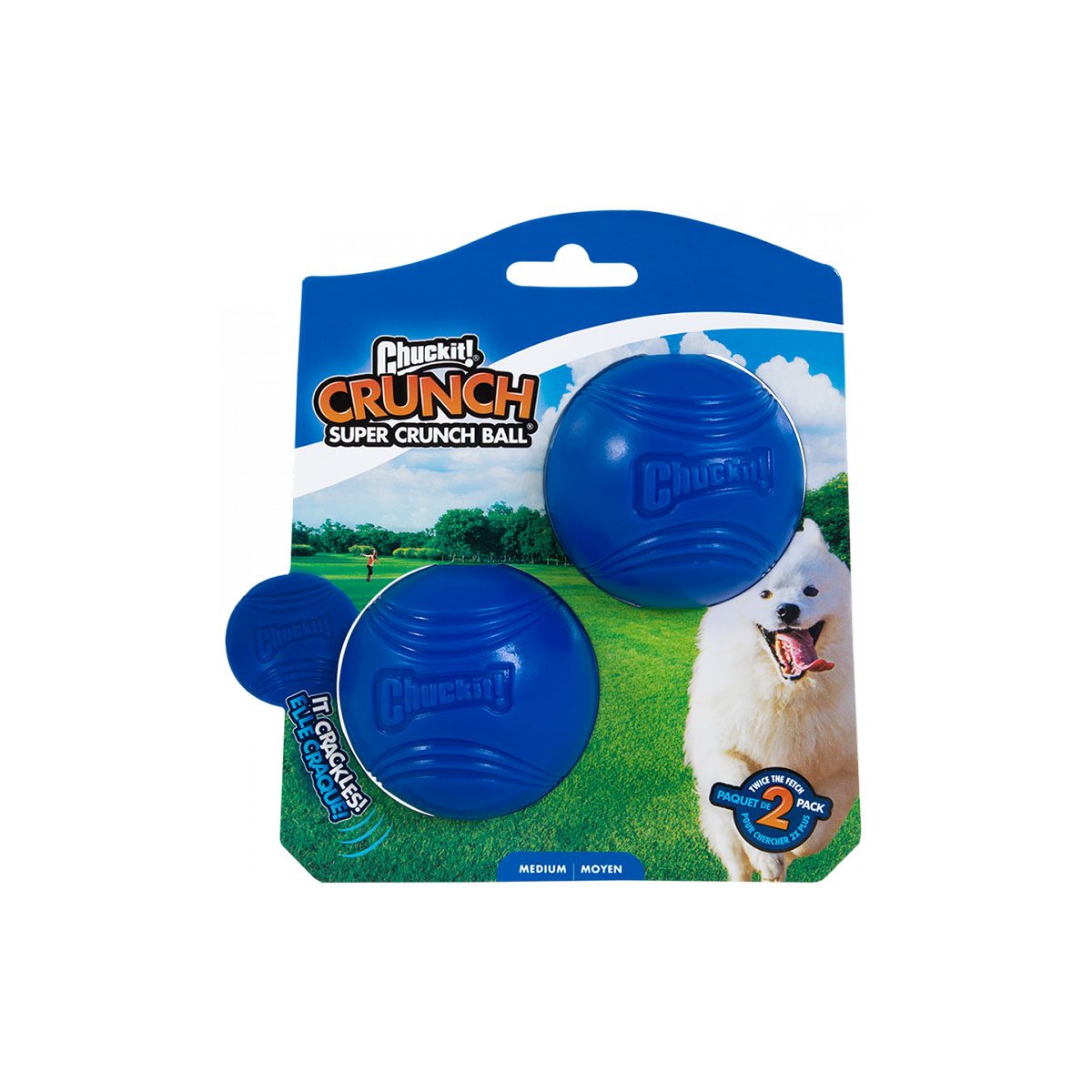 Chuckit Super Crunch Ball. Honden hebben een natuurlijke instinctieve nieuwsgierigheid naar geluiden en deze Chuckit Super Crunch Ballen spelen daar goed op in! Tijdens het spelen en apporteren maken de ballen een krakend en knisperend geluid, waardoor de interesse van de hond gelijk gewekt is. bovendien zijn de ballen gemaakt van duurzaam TPR, waardoor ze bijzonder sterk zijn, en zijn ze dankzij de donkerblauwe kleur goed zichtbaar in gras en andere omgevingen. Door de afmetingen kunnen de Super Crunch ballen gebruikt worden met alle Chuckit Launchers in maat medium. Per verpakking ontvangt u twee Super Crunch ballen.