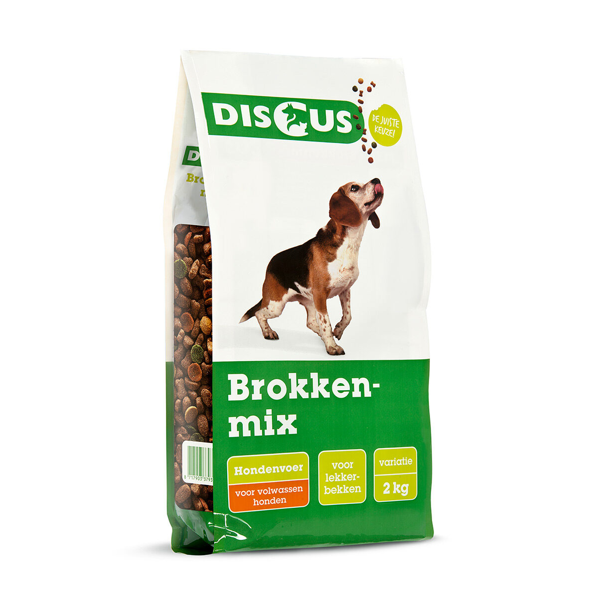 Discus Brokkenmix 2 kg. Discus Brokkenmix is complete maaltijd voor jouw volwassen hond. De mix bevat alle belangrijke nutriënten om jouw actieve hond te voorzien van energie om te kunnen spelen en rennen. Dankzij de variatie in smaak en vorm is de brokkenmix ook geschikt voor kieskeurige honden.