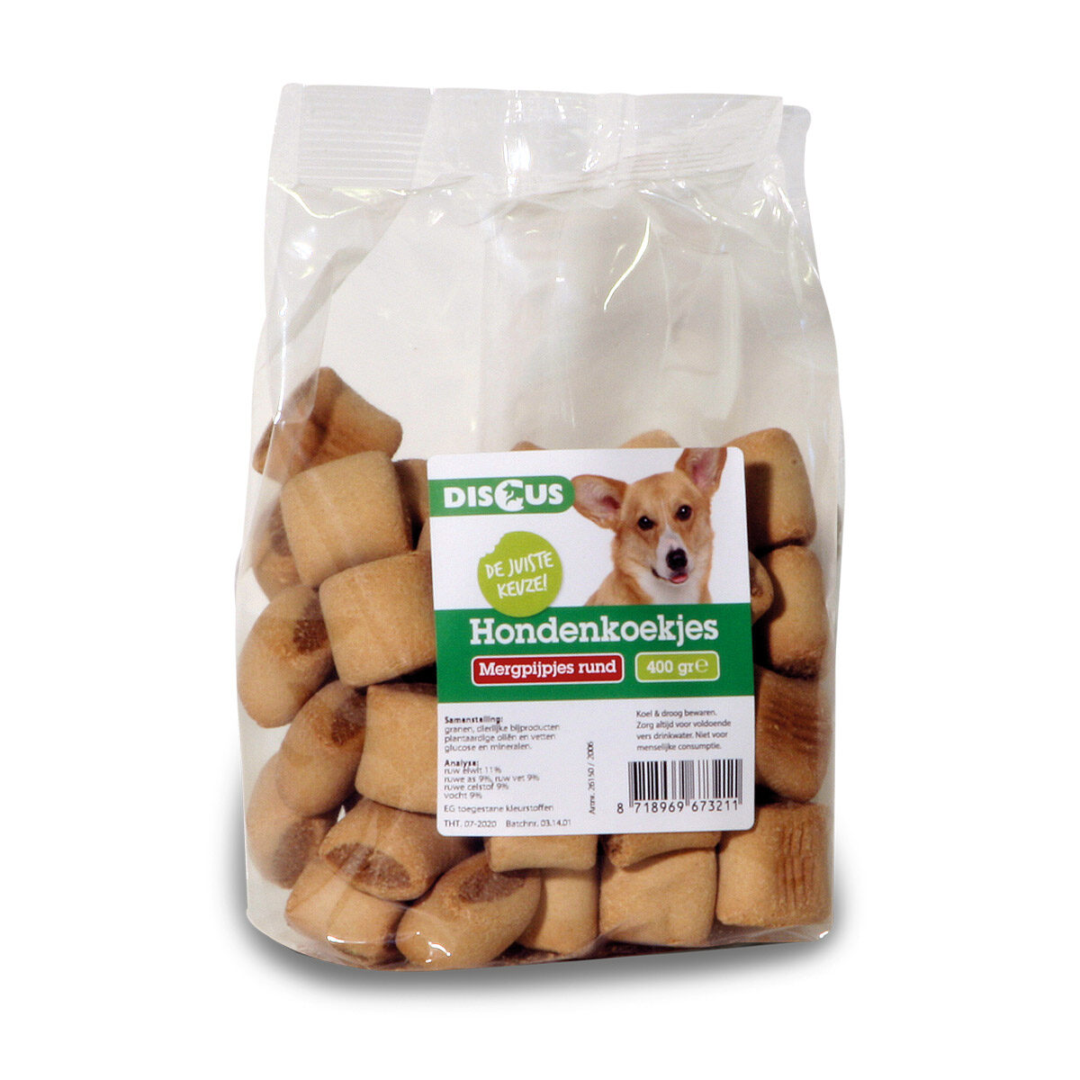De Discus Hondenkoekjes Rund Mergpijpjes 400gr zijn knapperige, populaire koekjes voor je hond. Deze Discus hondenkoekjes zijn favoriet bij vele honden waardoor het vrijwel altijd de juiste keuze is. De koekjes zijn heerlijk krokant, wat ervoor zorgt dat je hond het koekje nog lekkerder vindt.