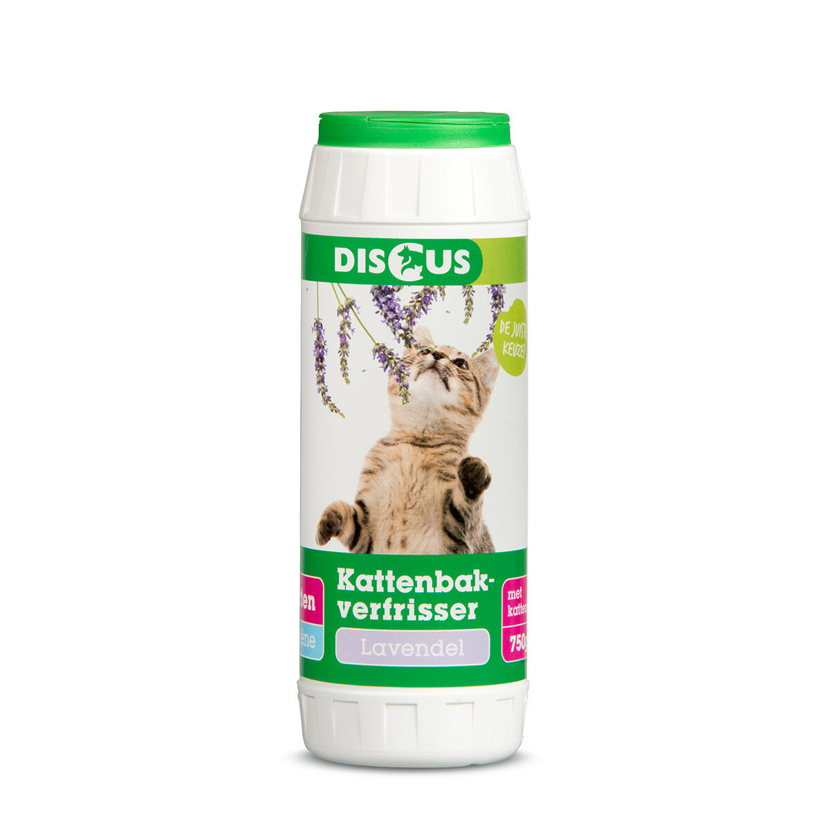 Discus Kattenbak Geurverdrijver Lavendel 750 gr. De Discus kattenbak geurverdrijver bevat een fris grasparfum dat zorgt voor een frisse geur in de kattenbak. Strooi wat poeder op het kattengrit en de bak blijft langer fris.