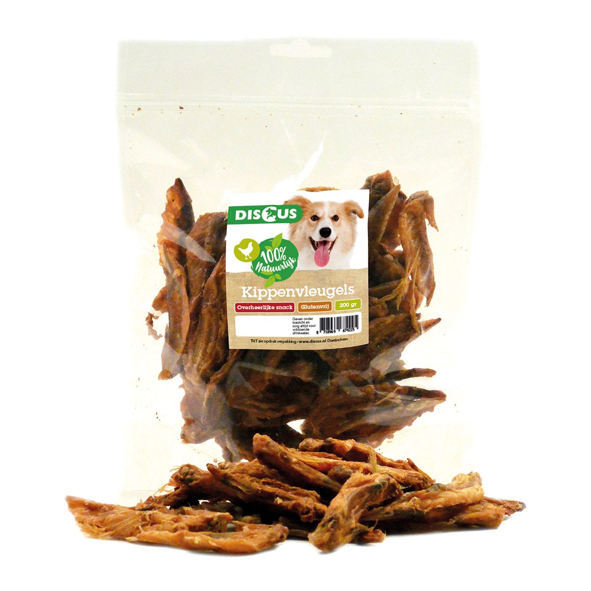 Discus Kippenvleugels 200 gram. Discus kippenvleugels zijn heerlijke, natuurlijke snacks voor honden. De kippenvleugels zijn over het algemeen sneller weg te kauwen dan andere kauwsnacks zoals de runderoren of lamskophuid. Doordat de kippenvleugels makkelijk te kauwen zijn, zijn ze voor veel honden het ideale gezonde tussendoortje.
