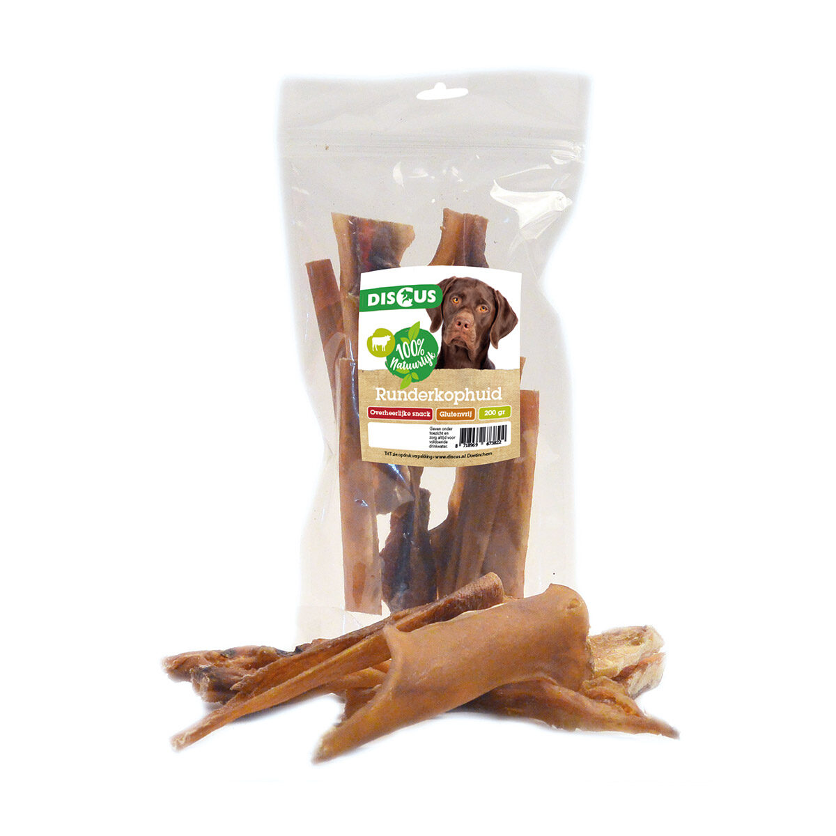 Discus Kophuid Rund 200 gram. Deze 100% natuurlijke, gedroogde runderkophuid van Discus zorgt voor heerlijk lang kauwplezier voor je hond. De runderkophuid is over het algemeen wat harder voor het gebit dan de lamskophuid. Hierdoor zal je hond er langer op kauwen en volop genieten. De runderkophuid is geschikt voor alle honden. Puppyâ