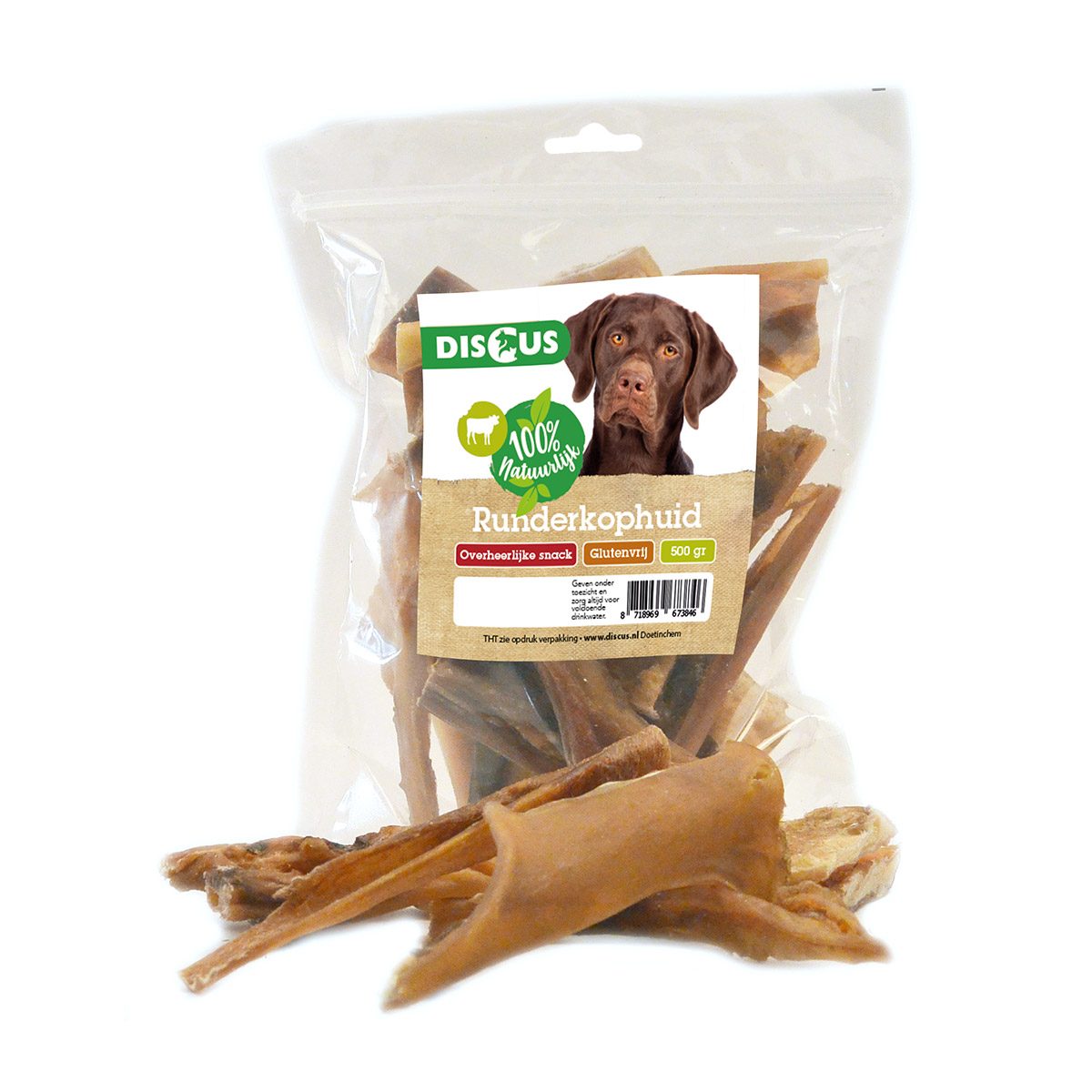 Discus Kophuid Rund 500 gram. Deze 100% natuurlijke, gedroogde runderkophuid van Discus zorgt voor heerlijk lang kauwplezier voor je hond. De runderkophuid is over het algemeen wat harder voor het gebit dan de lamskophuid. Hierdoor zal je hond er langer op kauwen en volop genieten. De runderkophuid is geschikt voor alle honden. Puppyâ